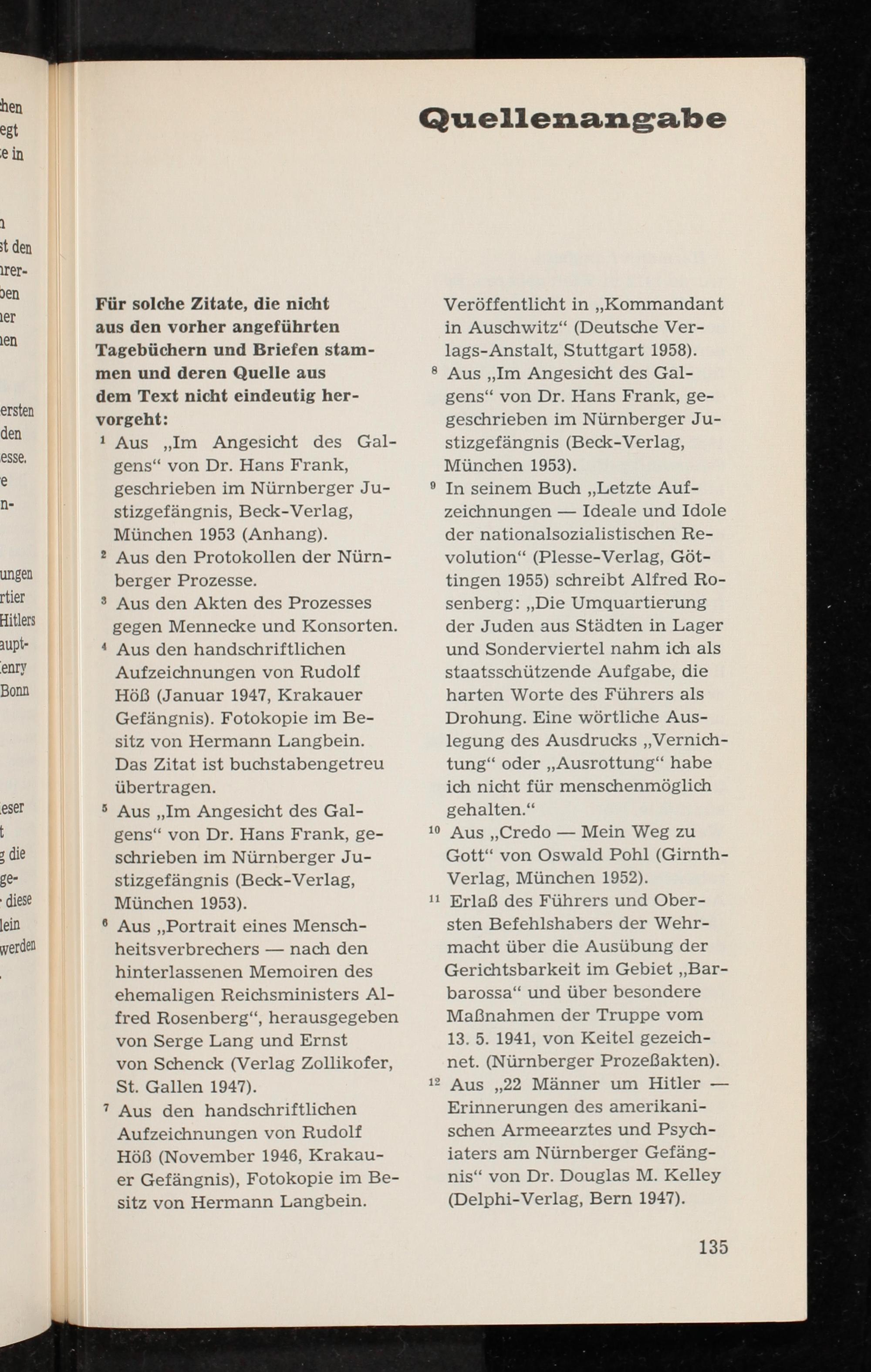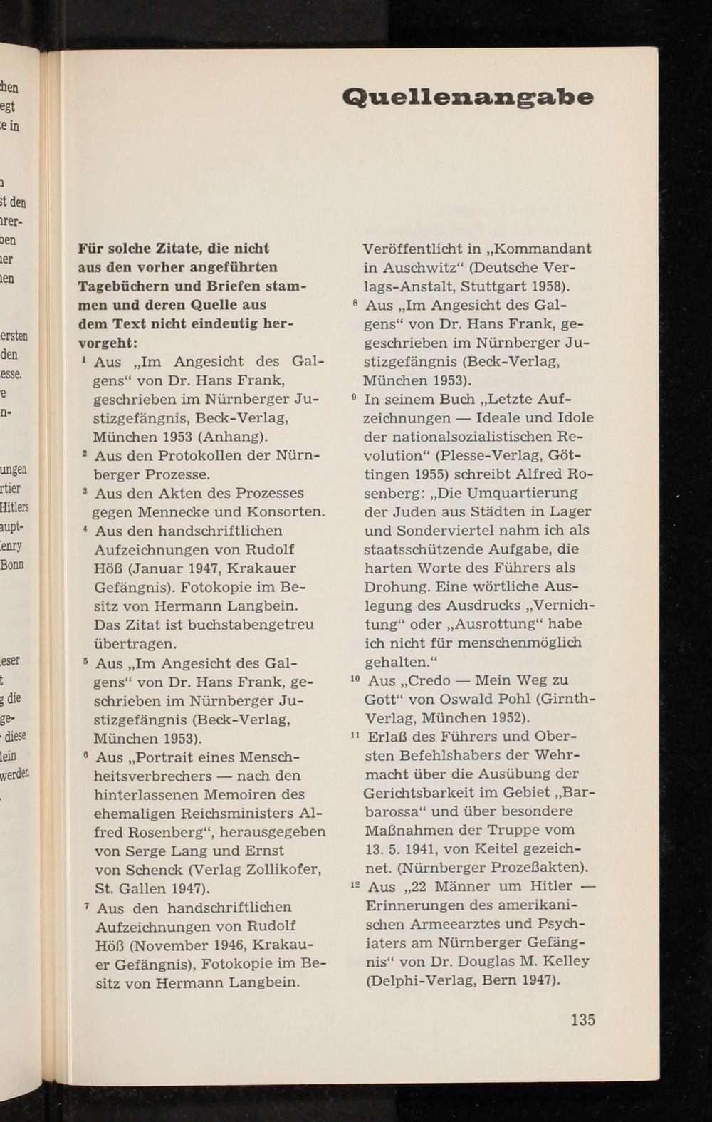 Veröffentlicht in„Kommandant in Auschwitz“(Deutsche Ver- lags-Anstalt, Stuttgart 1958). Aus„Im Angesicht des Gal- gens‘“ von Dr. Hans Frank, ge- geschrieben im Nürnberger Ju- stizgefängnis(Beck-Verlag, München 1953).