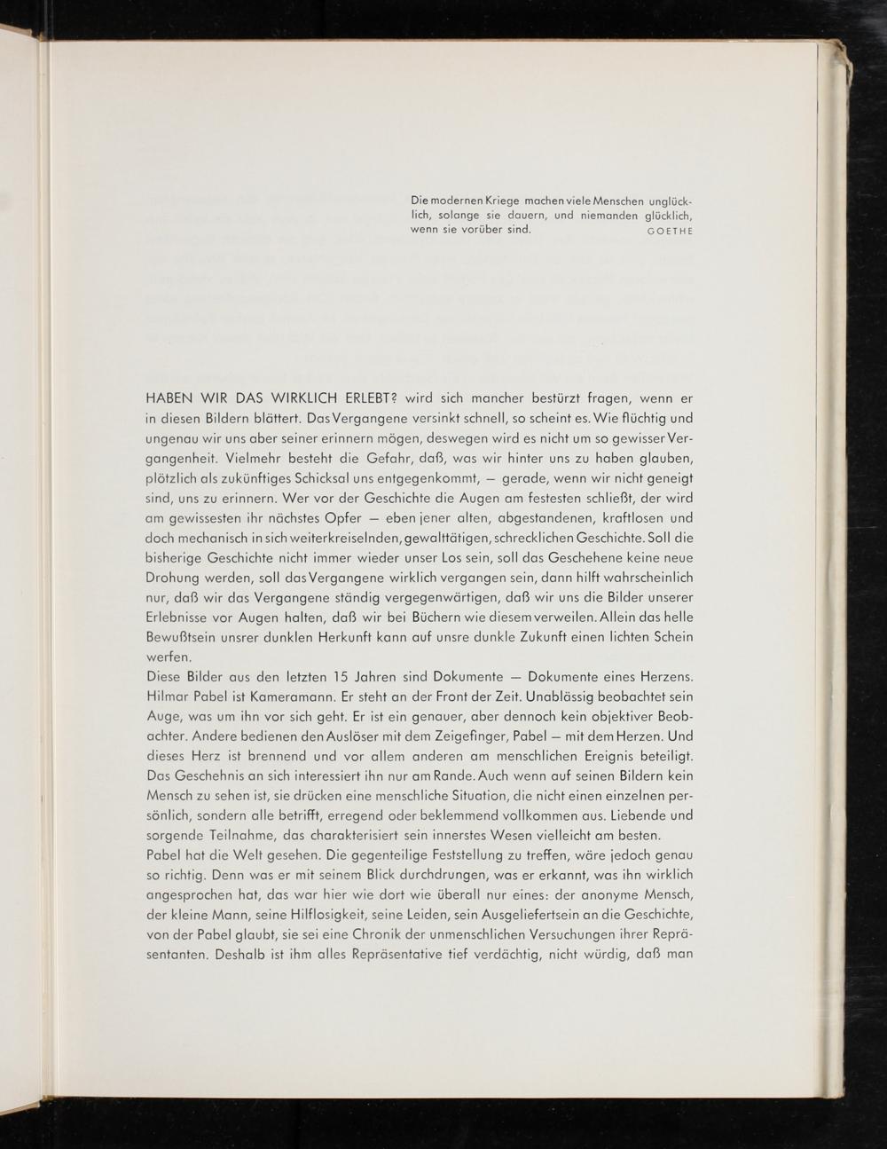 Diese Bilder aus den letzten 15 Jahren sind Dokumente— Dokumente eines Herzens. Hilmar Pabel ist Kameramann. Er steht an der Front der Zeit. Unablässig beobachtet sein Auge, was um ihn vor sich geht. Er ist ein genauer, aber dennoch kein objektiver Beob- achter. Andere bedienen den Auslöser mit dem Zeigefinger, Pabel— mit dem Herzen. Und dieses Herz ist brennend und vor allem anderen am menschlichen Ereignis beteiligt. Das Geschehnis an sich interessiert ihn nur am Rande. Auch wenn auf seinen Bildern kein Mensch zu sehen ist, sie drücken eine menschliche Situation, die nicht einen einzelnen per- sönlich, sondern alle betrifft, erregend oder beklemmend vollkommen aus. Liebende und sorgende Teilnahme, das charakterisiert sein innerstes Wesen vielleicht am besten. Pabel hat die Welt gesehen. Die gegenteilige Feststellung zu treffen, wäre jedoch genau so richtig. Denn was er mit seinem Blick durchdrungen, was er erkannt, was ihn wirklich angesprochen hat, das war hier wie dort wie überall nur eines: der anonyme Mensch, der kleine Mann, seine Hilflosigkeit, seine Leiden, sein Ausgeliefertsein an die Geschichte, von der Pabel glaubt, sie sei eine Chronik der unmenschlichen Versuchungen ihrer Reprä- sentanten. Deshalb ist ihm alles Repräsentative tief verdächtig, nicht würdig, daß man
