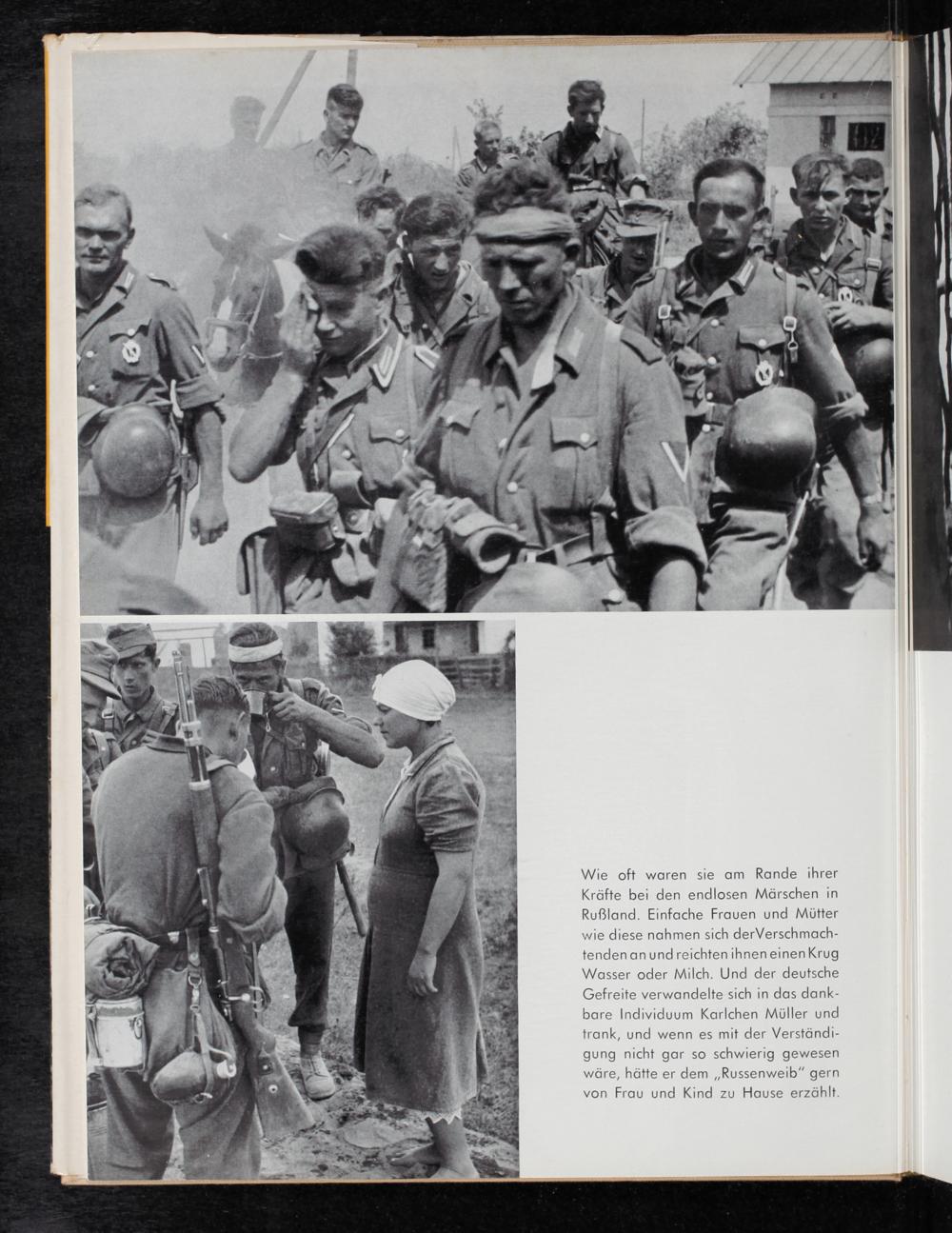 Wie oft waren sie am Rande ihrer Kräfte bei den endlosen Märschen in Rußland. Einfache Frauen und Mütter wie diese nahmen sich derVerschmach- tendenanundreichten ihneneinenKrug Wasser oder Milch. Und der deutsche Gefreite verwandelte sich in das dank- bare Individuum Karlchen Müller und trank, und wenn es mit der Verständi- gung nicht gar so schwierig gewesen wäre, hätte er dem„Russenweib” gern von Frau und Kind zu Hause erzählt.