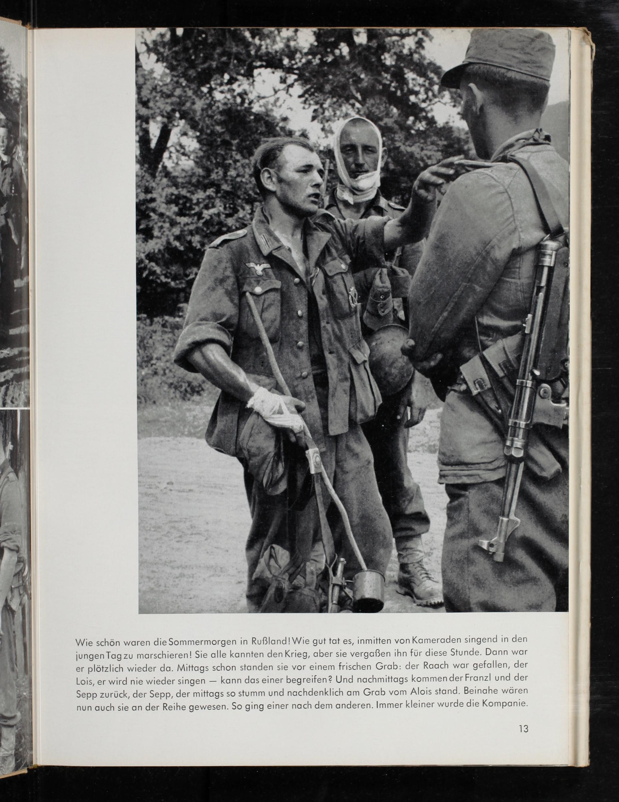 Wie schön waren dieSommermorgen in Rußland!Wie gut tat es, inmitten von Kameraden singend in den jungen Tagzu marschieren! Sie alle kannten denKrieg, aber sie vergaßen ihn für diese Stunde. Dann war er plötzlich wieder da. Mittags schon standen sie vor einem frischen Grab: der Raach war gefallen, der Lois, er wird nie wieder singen— kann das einer begreifen? Und nachmittags kommen der Franzl und der Sepp zurück, der Sepp, der mittags so stumm und nachdenklich am Grab vom Alois stand. Beinahe wären nun auch sie an der Reihe gewesen. So ging einer nach dem anderen. Immer kleiner wurde die Kompanie.