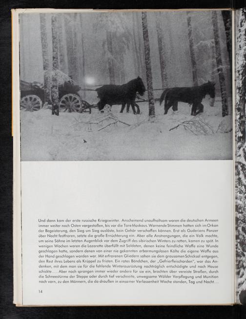 Und dann kam der erste russische Kriegswinter. Anscheinend unaufhaltsam waren die deutschen Armeen immer weiter nach Osten vorgestoßen, bis vor die Tore Moskaus. Warnende Stimmen hatten sich im Orkan der Begeisterung, den Sieg um Sieg auslöste, kein Gehör verschaffen können. Erst als Guderians Panzer über Nacht festfroren, setzte die große Ernüchterung ein. Aber alle Anstrengungen, die ein Volk machte, um seine Söhne im letzten Augenblick vor dem Zugriff des sibirischen Winters zu retten, kamen zu spät. In wenigen Wochen waren die Lazarette überfüllt mit Soldaten, denen keine feindliche Waffe eine Wunde geschlagen hatte, sondern denen von einer nie gekannten erbarmungslosen Kälte die eigene Waffe aus der Hand geschlagen worden war. Mit erfrorenen Gliedern sahen sie dem grausamen Schicksal entgegen, den Rest ihres Lebens als Krüppel zu fristen. Ein rotes Bändchen, der„Gefrierfleischorden”, war das An- denken, mit dem man sie für die fehlende Winterausrüstung nachträglich entschädigte und nach Hause schickte... Aber noch sprangen immer wieder andere für sie ein, brachten über vereiste Straßen, durch die Schneestürme der Steppe oder durch tief verschneite, unwegsame Wälder Verpflegung und Munition nach vorn, zu den Männern, die da draußen in einsamer Verlassenheit Wache standen, Tag und Nacht...