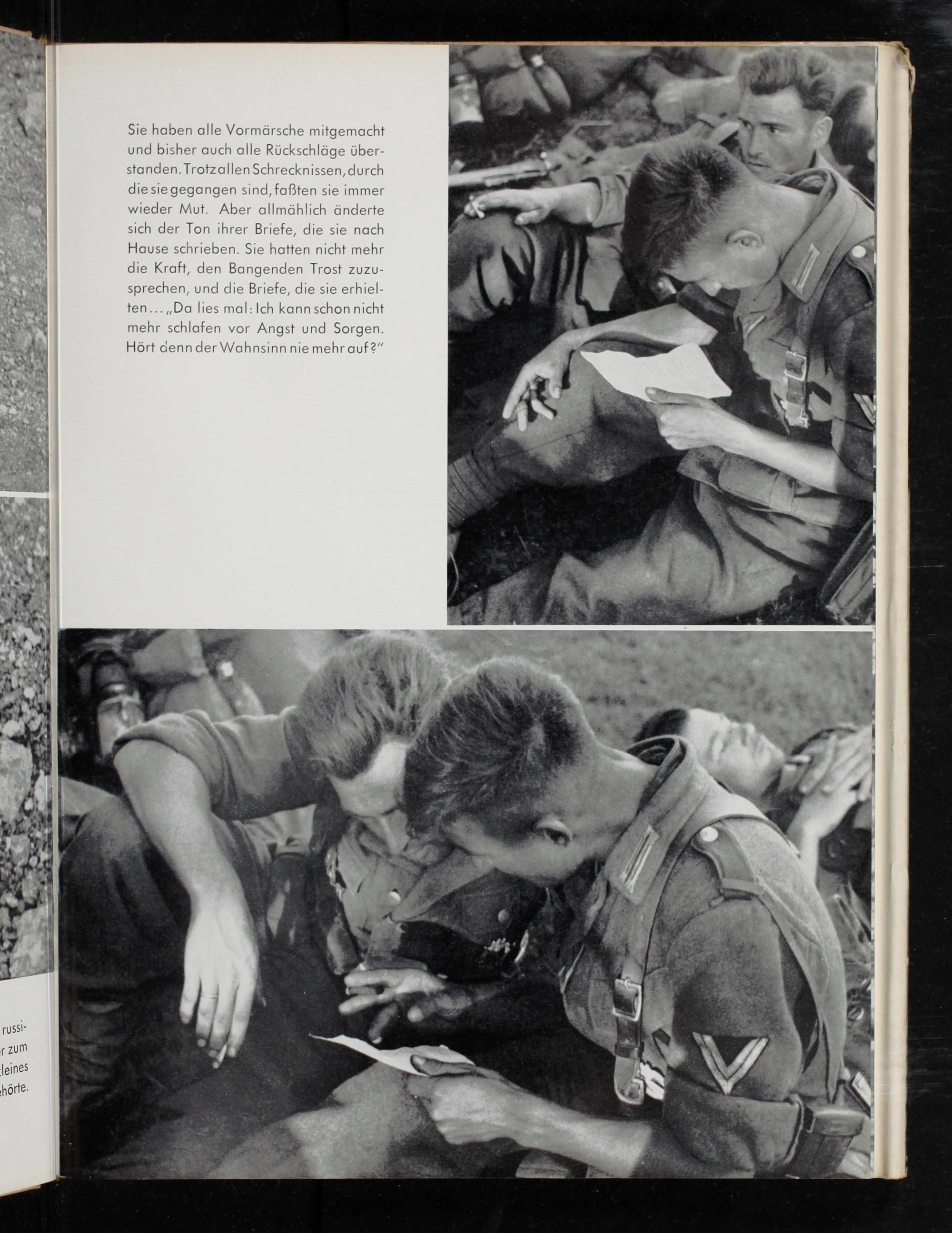Sie haben alle Vormärsche mitgemacht und bisher auch alle Rückschläge über- standen. Trotzallen Schrecknissen, durch diesiegegangen sind, faßten sie immer wieder Mut. Aber allmählich änderte sich der Ton ihrer Briefe, die sie nach Hause schrieben. Sie hatten nicht mehr die Kraft, den Bangenden Trost zuzu- sprechen, und die Briefe, die sie erhiel- ten...„Da lies mal: Ich kann schon nicht