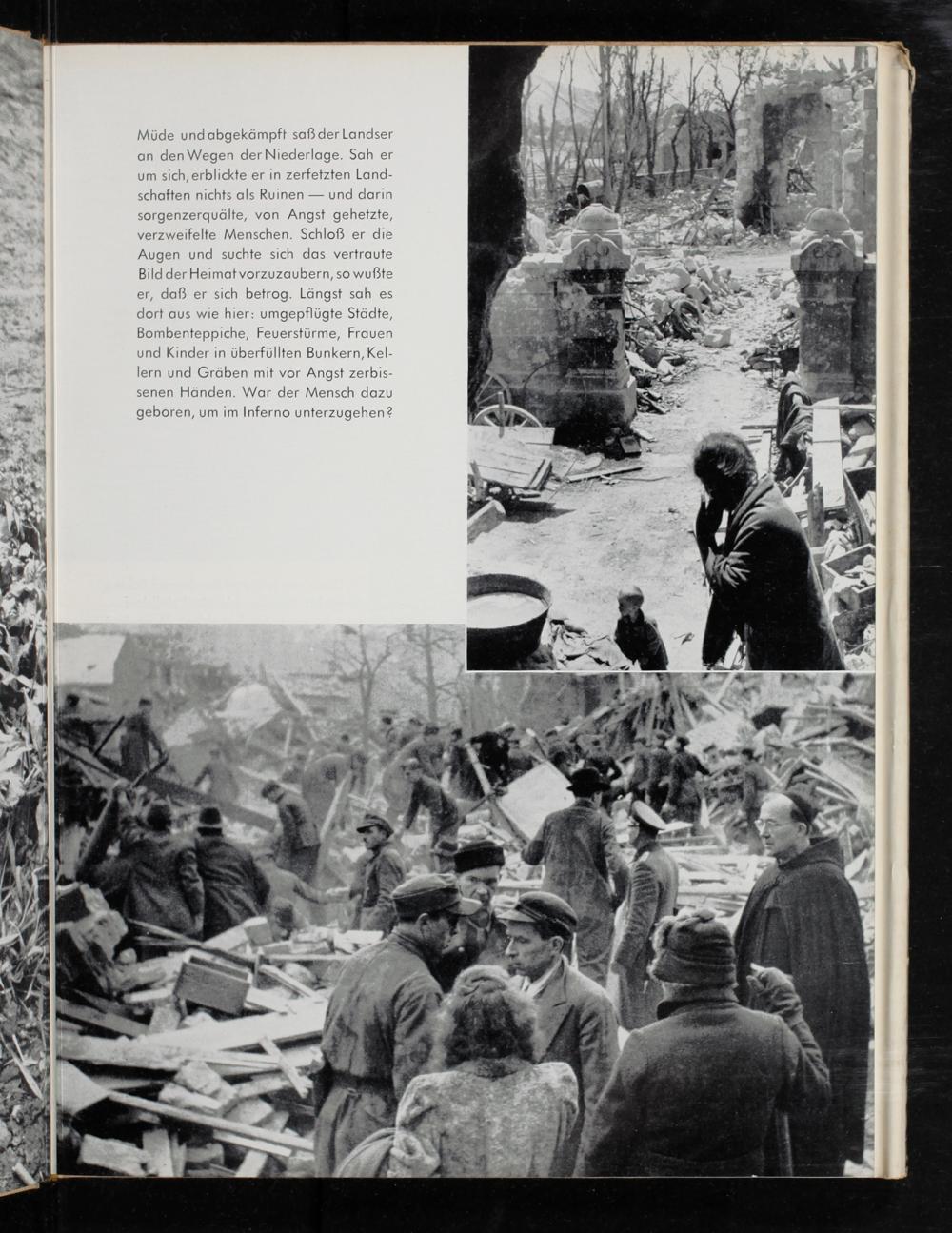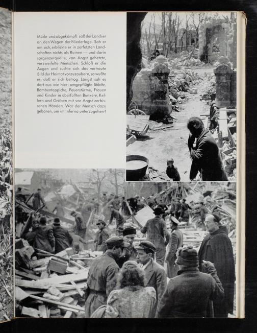 Müde undabgekämpft saß der Landser an den Wegen derNiederlage. Sah er um sich, erblickte er in zerfetzten Land- schaften nichts als Ruinen— und darin sorgenzerquälte, von Angst gehetzte, verzweifelte Menschen. Schloß er die Augen und suchte sich das vertraute Bild der Heimat vorzuzaubern, so wußte er, daß er sich betrog. Längst sah es dort aus wie hier: umgepflügte Städte, Bombenteppiche, Feuerstürme, Frauen und Kinder in überfüllten Bunkern, Kel-