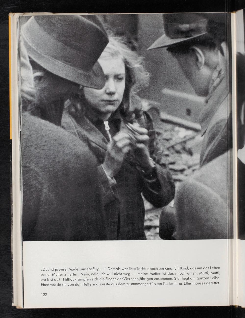 „Das ist jaunser Mädel, unsereElly....” Damals war ihre Tochter noch ein Kind. EinKind, das um das Leben seiner Mutter zitterte:„Nein, nein, ich will nicht weg— meine Mutter ist doch noch unten, Mutti, Mutti, wo bist du?” Hilfloskrampfen sich die Finger der Vierzehnjährigen zusammen. Sie fliegt am ganzen Leibe. Eben wurde sie von den Helfern als erste aus dem zusammengestürzten Keller ihres Elternhauses gerettet.