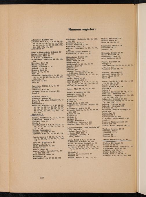 Dürrfeld, Walther 4, 9, 13, 14, 16, 17, 18, 20, 23, 24, 26, 32, 34, 35, 39, 41, 42, 44, 51, 67, 69, 70,#1, 72, 73 74, 25, 105, 110, 113, 116, 117, 118 Dylewski 3
