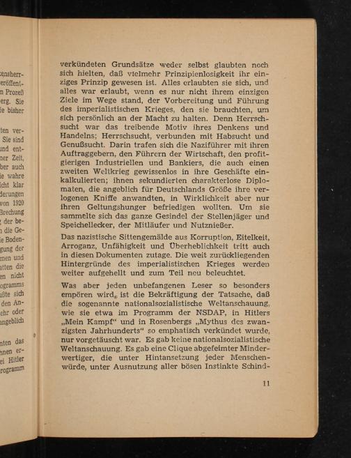 Was aber jeden unbefangenen Leser so besonders empören wird, ist die Bekräftigung der Tatsache, daß die sogenannte nationalsozialistische Weltanschauung, wie sie etwa im Programm der NSDAP, in Hitlers „Mein Kampf“ und in Rosenbergs„Mythus des zwan- zigsten Jahrhunderts“ so emphatisch verkündet wurde, nur vorgetäuscht war. Es gab keine nationalsozialistische Weltanschauung. Es gab eine Clique abgefeimter Minder- wertiger, die unter Hintansetzung jeder Menschen- würde, unter Ausnutzung aller bösen Instinkte Schind-