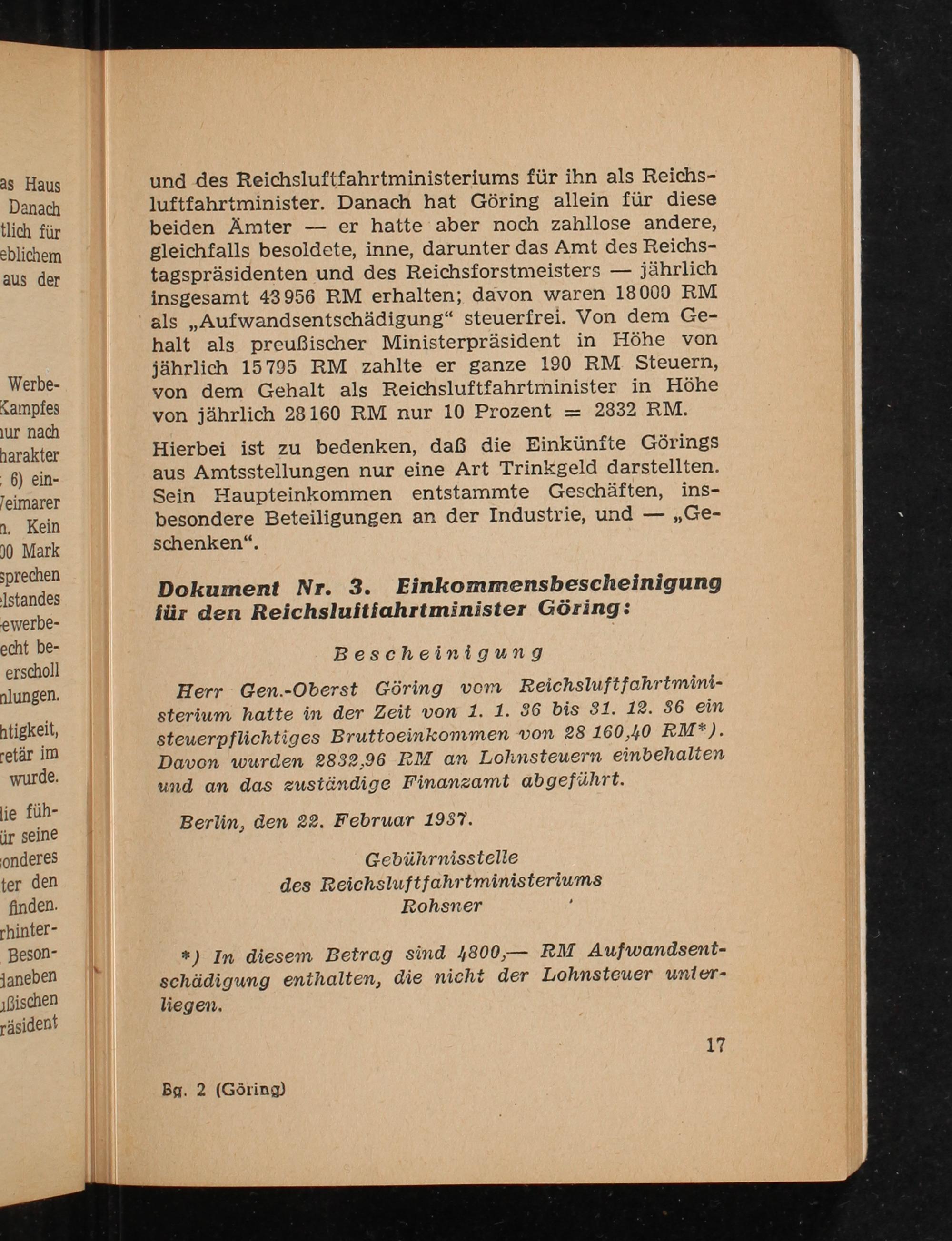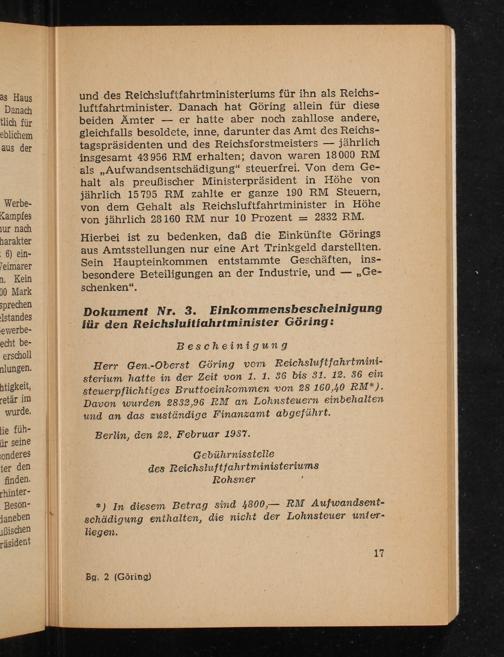 Dokument Nr. 3. Einkommensbescheinigung iür den Reichsluitiahrtminister Göring: