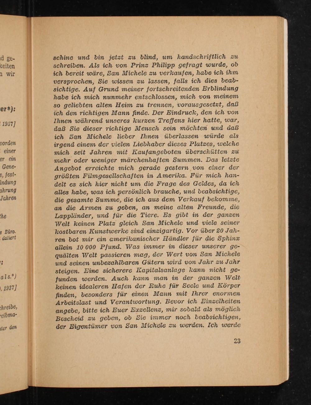 schine und bin jeizt zu blind, um handschriftlich zu schreiben. Als ich von Prinz Philipp gefragt wurde, ob ich bereit wäre, San Michele zu verkaufen, habe ich ihm versprochen, Sie wissen zu lassen, falls ich dies beab- sichtige. Auf Grund meiner fortschreitenden Erblindung habe ich mich nunmehr entschlossen, mich von meinem so geliebten alten Heim zu trennen, vorausgesetzt, daß ich den richtigen Mann finde. Der Eindruck, den ich von Ihnen während unseres kurzen Treffens hier hatte, war, daß Sie dieser richtige Mensch sein möchten und daß ich San Michele lieber Ihnen überlassen würde als irgend einem der vielen Liebhaber dieses Platzes, welche mich seit Jahren mit Kaufangeboten überschütten zu mehr oder weniger märchenhaften Summen. Das leizie Angebot erreichte mich gerade gestern von einer der größten Filmgesellschaften in Amerika. Für mich han- delt es sich hier nicht um die Frage des Geldes, da ich alles habe, was ich persönlich brauche, und beabsichtige, die gesamte Summe, die ich aus dem Verkauf bekomme, an die Armen zu geben, an meine alten Freunde, die Lappländer, und für die Tiere. Es gibt in der ganzen Welt keinen Platz gleich San Michele und viele seiner kostbaren Kunstwerke sind einzigartig. Vor über 20 Jah- ren bot mir ein amerikanischer Händler für die Sphing allem 10000 Pfund. Was immer in dieser unserer ge- quälten Welt passieren mag, der Wert von San Michele und seinen unbezahlbaren Gütern wird von Jahr zu Jahr steigen. Eine sicherere Kapitalsanlage kann nicht ge- funden werden. Auch kann man in der ganzen Welt keinen idealeren Hafen der Ruhe für Seele und Körper finden, besonders für einen Maum mit Ihrer enormen Arbeitslast und Verantwortung. Bevor ich Einzelheiten angebe, bitte ich Euer Exzellenz, mir sobald als möglich Bescheid zu geben, ob Sie immer noch beabsichtigen, der Eigentümer von San Michele zu werden. Ich werde