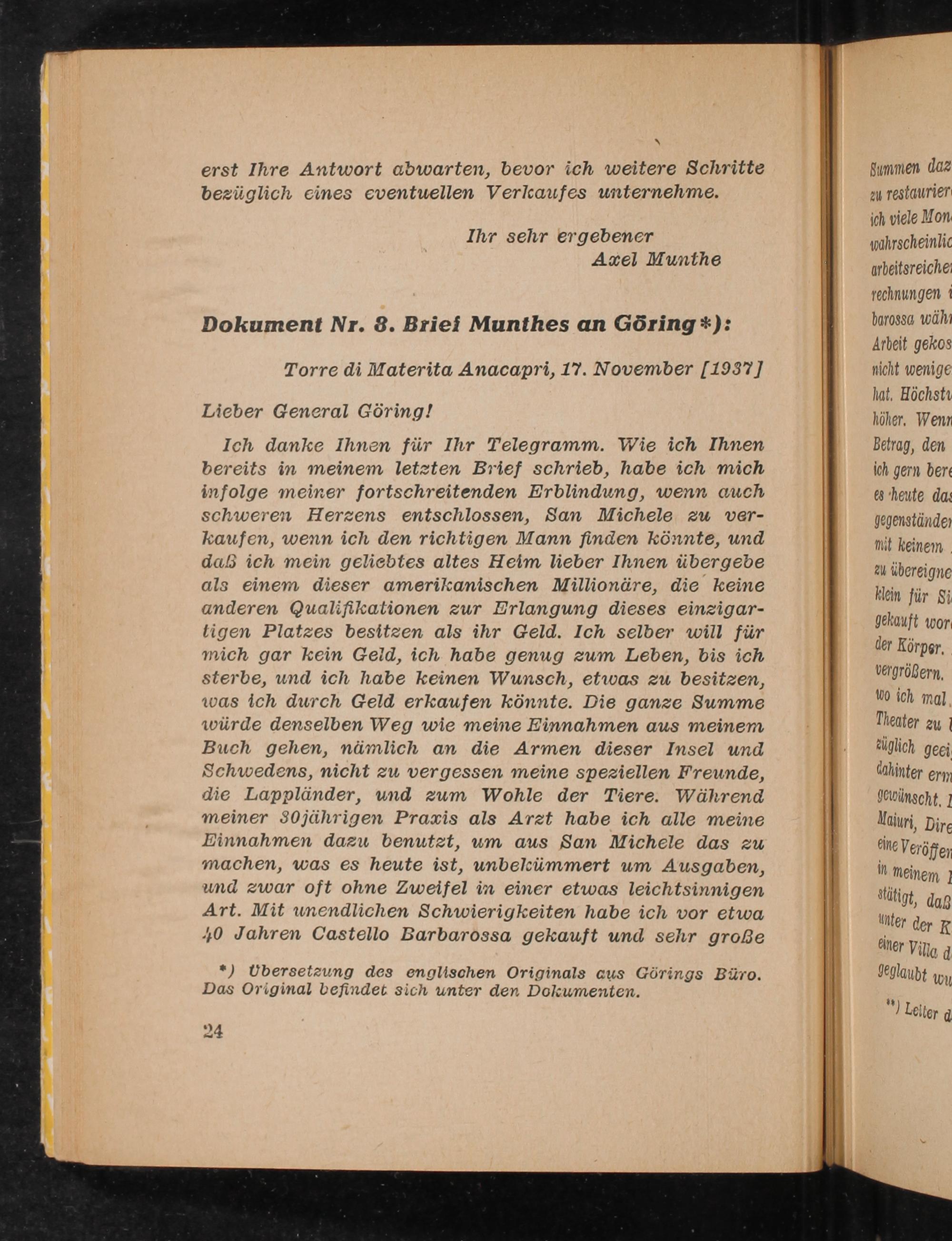 Ich danke Ihnen für Ihr Telegramm. Wie ich Ihnen bereits in meinem letzten Brief schrieb, habe ich mich infolge meiner fortschreitenden Erblindung, wenn auch schweren Herzens entschlossen, San Michele zu ver- kaufen, wenn ich den richtigen Mann finden könnte, und daß ich mein geliebtes altes Heim lieber Ihnen übergebe als einem dieser amerikanischen Millionäre, die keine anderen Qualifikationen zur Erlangung dieses einzigar- tigen Platzes besitzen als ihr Geld. Ich selber will für mich gar kein Geld, ich habe genug zum Leben, bis ich sterbe, und ich habe keinen Wunsch, etwas zu besitzen, was ich durch Geld erkaufen könnte. Die ganze Summe würde denselben Weg wie meine Einnahmen aus meinem Buch gehen, nämlich an die Armen dieser Insel und Schwedens, nicht zu vergessen meine speziellen Freunde, die Lappländer, und zum Wohle der Tiere. Während meiner 30jährigen Praxis als Arzt habe ich alle meine Einnahmen dazu benutzt, um aus San Michele das zu machen, was es heute ist, unbekümmert um Ausgaben, und zwar oft ohne Zweifel in einer etwas leichtsinnigen Art. Mit unendlichen Schwierigkeiten habe ich vor etwa 40 Jahren Castello Barbarossa gekauft und sehr große
