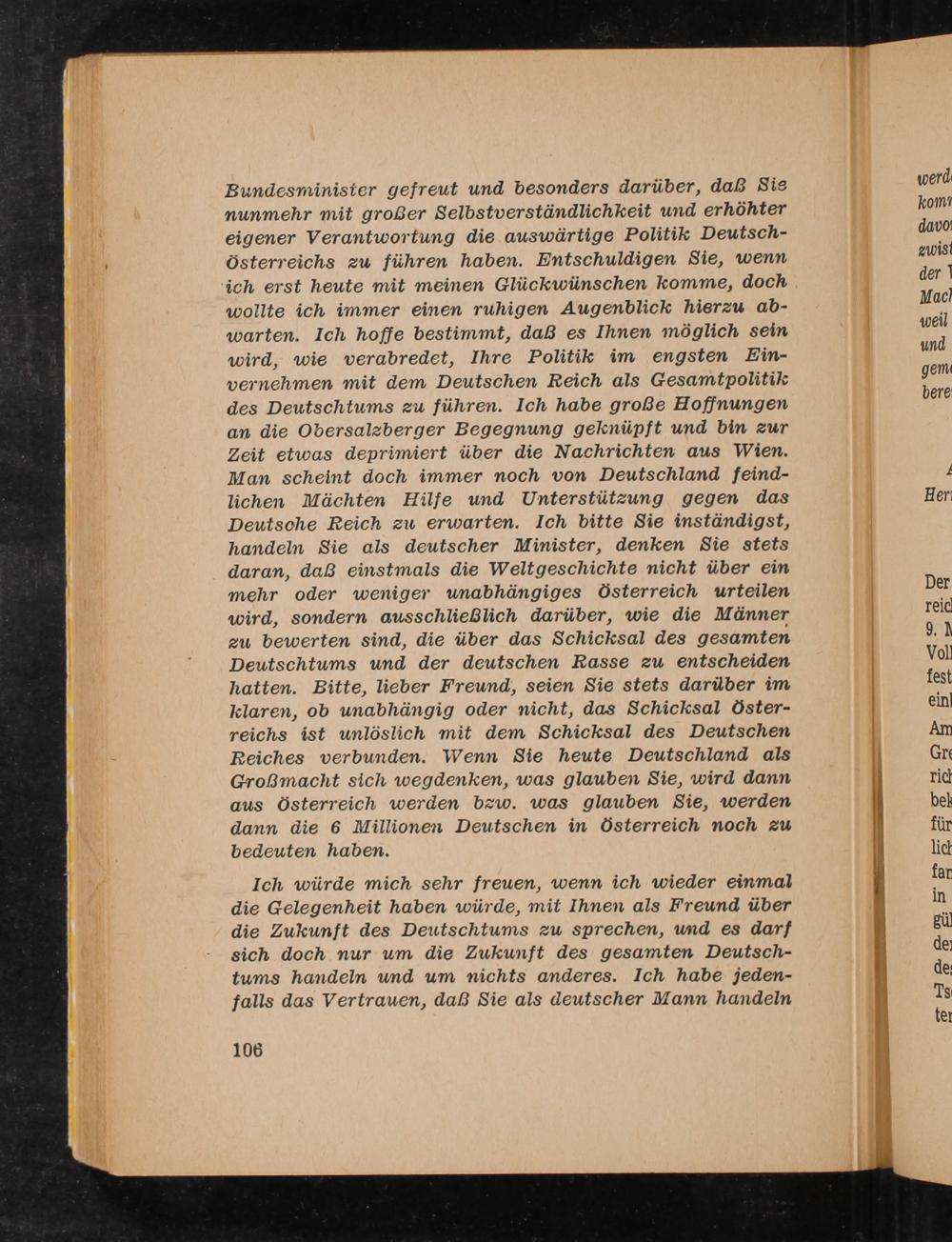 Ich würde mich sehr freuen, wenn ich wieder einmal die Gelegenheit haben würde, mit Ihnen als Freund über die Zukunft des Deutschtums zu sprechen, und es darf sich doch nur um die Zukunft des gesamten Deutsch- tums handeln und um nichts anderes. Ich habe jeden- falls das Vertrauen, daß Sie als deutscher Mann handeln