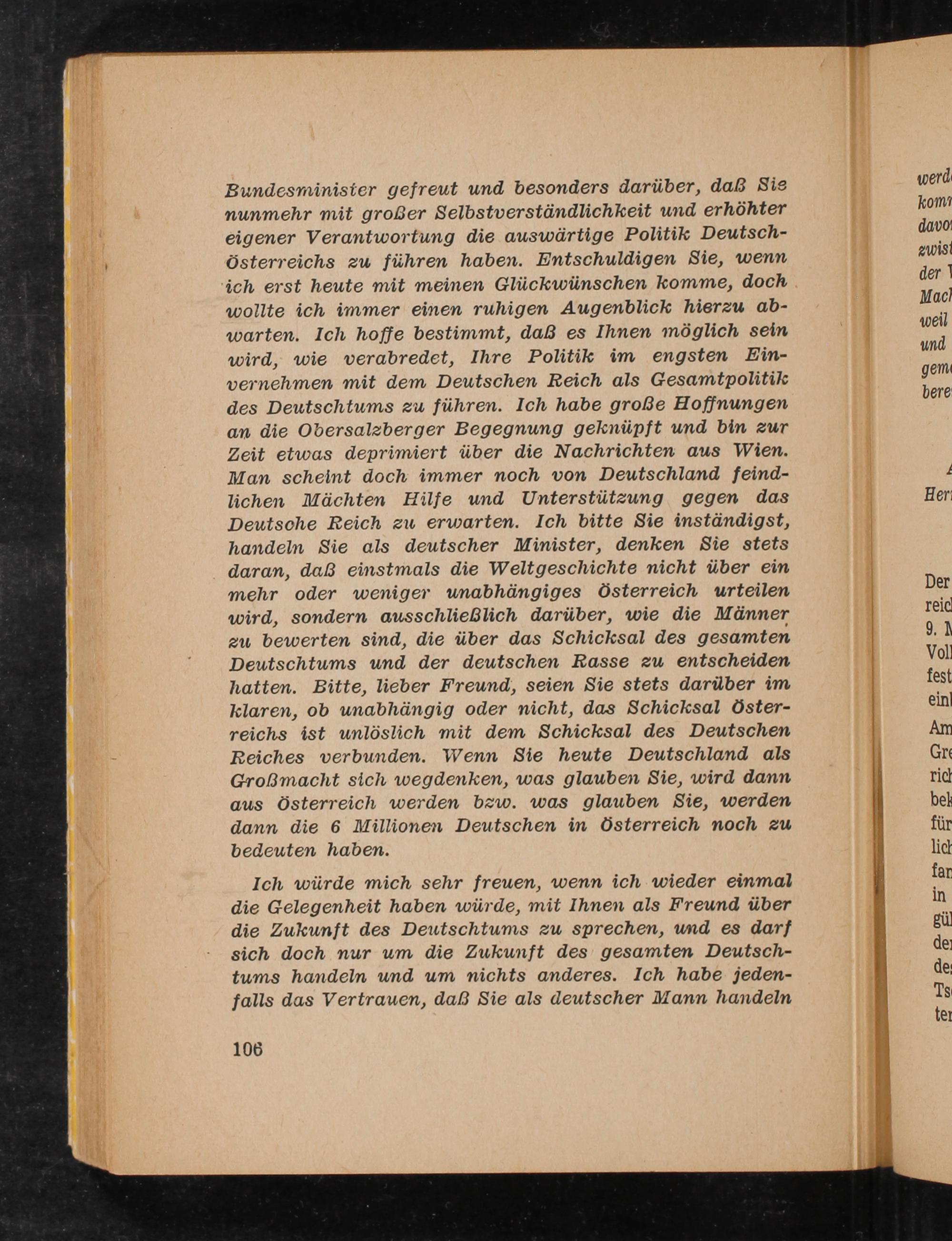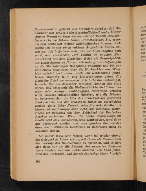 wollte ich immer einen ruhigen Augenblick hierzu ab- warten. Ich hoffe bestimmt, daß es Ihnen möglich sein wird, wie verabredet, Ihre Politik im engsten Ein- vernehmen mit dem Deutschen Reich als Gesamtpolitik des Deutschtums zu führen. Ich habe große Hofjnungen an die Obersalzberger Begegnung geknüpft und bin zur Zeit etwas deprimiert über die Nachrichten aus Wien. Man scheint doch immer noch von Deutschland feind- lichen Mächten Hilfe und Unterstützung gegen das Deutsche Reich zu erwarten. Ich bitte Sie inständigst, handeln Sie als deutscher Minister, denken Sie stets daran, daß einstmals die Weltgeschichte nicht über ein mehr oder weniger umabhängiges Österreich urteilen wird, sondern ausschließlich darüber, wie die Männer zu bewerten sind, die über das Schicksal des gesamten Deutschtums und der deutschen Rasse zu entscheiden hatten. Bitte, lieber Freund, seien Sie stets darüber im klaren, ob unabhängig oder nicht, das Schicksal Öster- reichs ist unlöslich mit dem Schicksal des Deutschen Reiches verbunden. Wenn Sie heute Deutschland als Großmacht sich wegdenken, was glauben Sie, wird dann aus Österreich werden bzw. was glauben Sie, werden dann die 6 Millionen Deutschen in Österreich noch zu bedeuten haben.