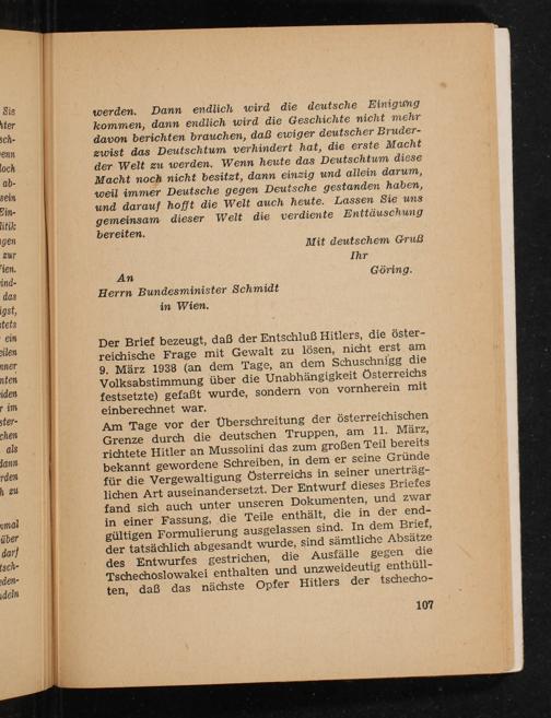 Am Tage vor der Überschreitung der österreichischen Grenze durch die deutschen Truppen, am 11. März, richtete Hitler an Mussolini das zum großen Teil bereits bekannt gewordene Schreiben, in dem er seine Gründe für die Vergewaltigung Österreichs in seiner unerträg- lichen Art auseinandersetzt. Der Entwurf dieses Briefes fand sich auch unter unseren Dokumenten, und zwar in einer Fassung, die Teile enthält, die in der end- gültigen Formulierung ausgelassen sind. In dem Brief, der tatsächlich abgesandt wurde, sind sämtliche Absätze des Entwurfes gestrichen, die Ausfälle gegen die Tschechoslowakei enthalten und unzweideutig enthüll- ten, daß das nächste Opfer Hitlers der tschecho-