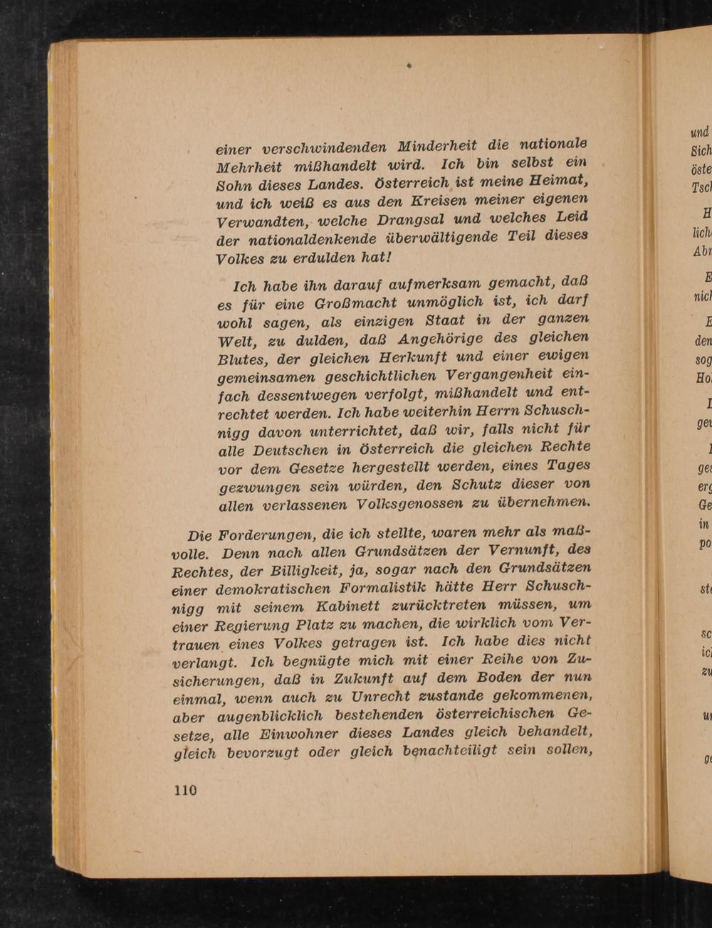 einer verschwindenden Minderheit die nationale Mehrheit mißhandelt wird. Ich bin selbst ein Sohn dieses Landes. Österreich ist meine Heimat, und ich weiß es aus den Kreisen meiner eigenen Verwandten, welche Drangsal und welches Leid der nationaldenkende überwältigende Teil dieses Volkes zu erdulden hat!