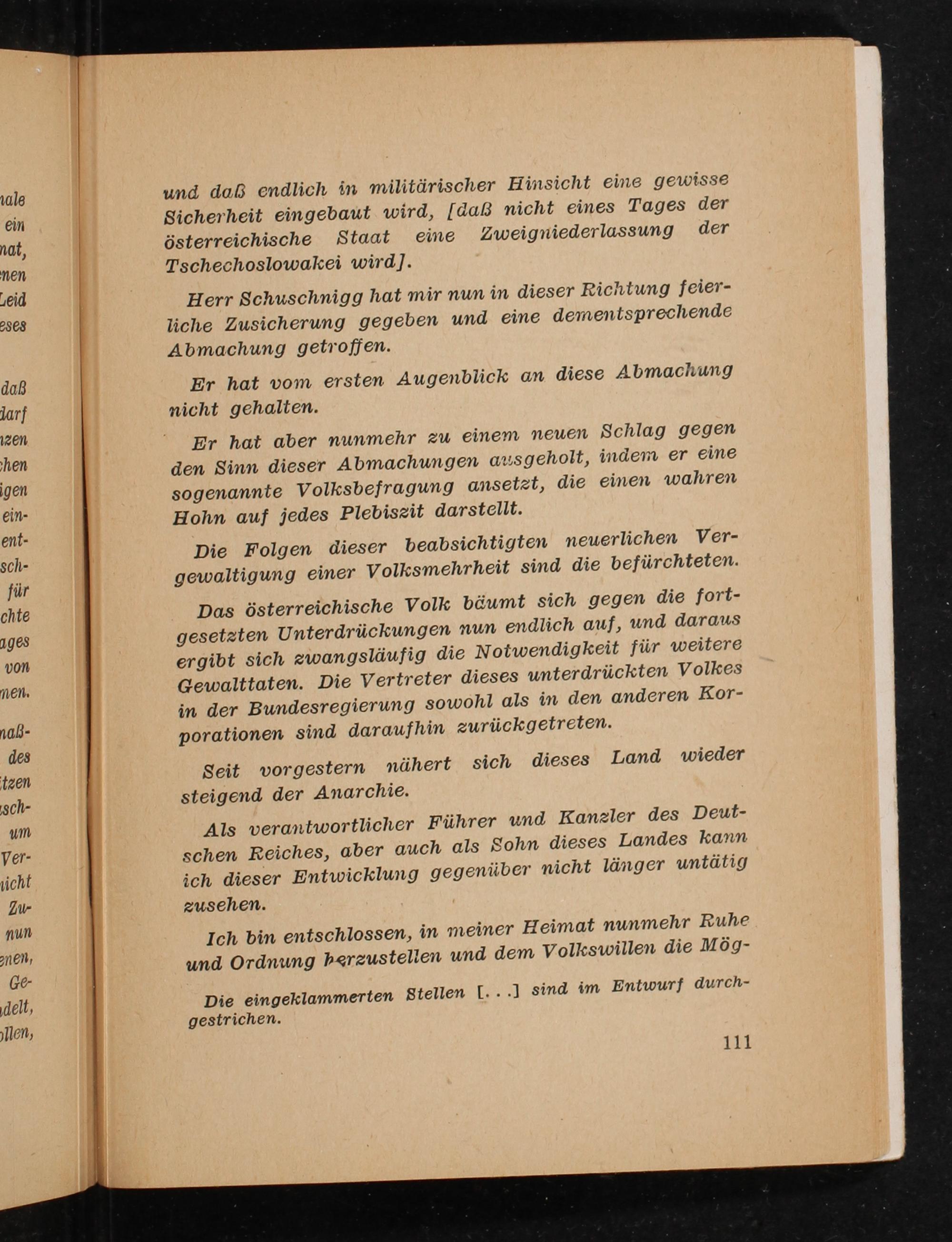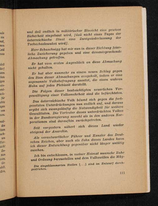 Das österreichische Volk bäumt sich gegen die fort- gesetzten Unterdrückungen nun endlich auf, und daraus ergibt sich zwangsläufig die N otwendigkeit für weitere Gewalttaten. Die Vertreter dieses unterdrückten Volkes in der Bundesregierung sowohl als in den anderen Kor- porationen sind daraufhin zurückgetreten.
