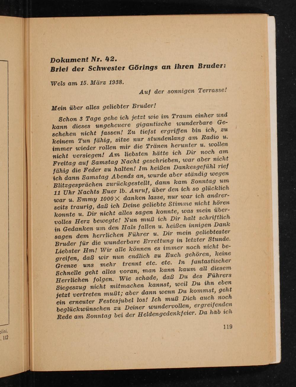 Dokument Nr. 42. Brief der Schwester Görings an ihren Bruder: