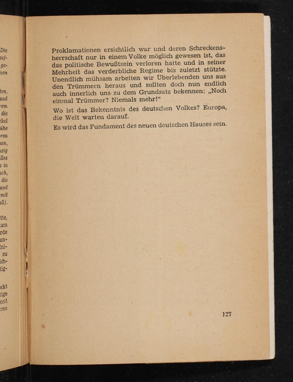 Proklamationen ersichtlich war und deren Schreckens- herrschaft nur in einem Volke möglich gewesen ist, das das politische Bewußtsein verloren hatte und in seiner Mehrheit das verderbliche Regime bis zuletzt stützte. Unendlich mühsam arbeiten wir Überlebenden uns aus den Trümmern heraus und sollten doch nun endlich auch innerlich uns. zu dem Grundsatz bekennen:„Noch einmal Trümmer? Niemals mehr!“