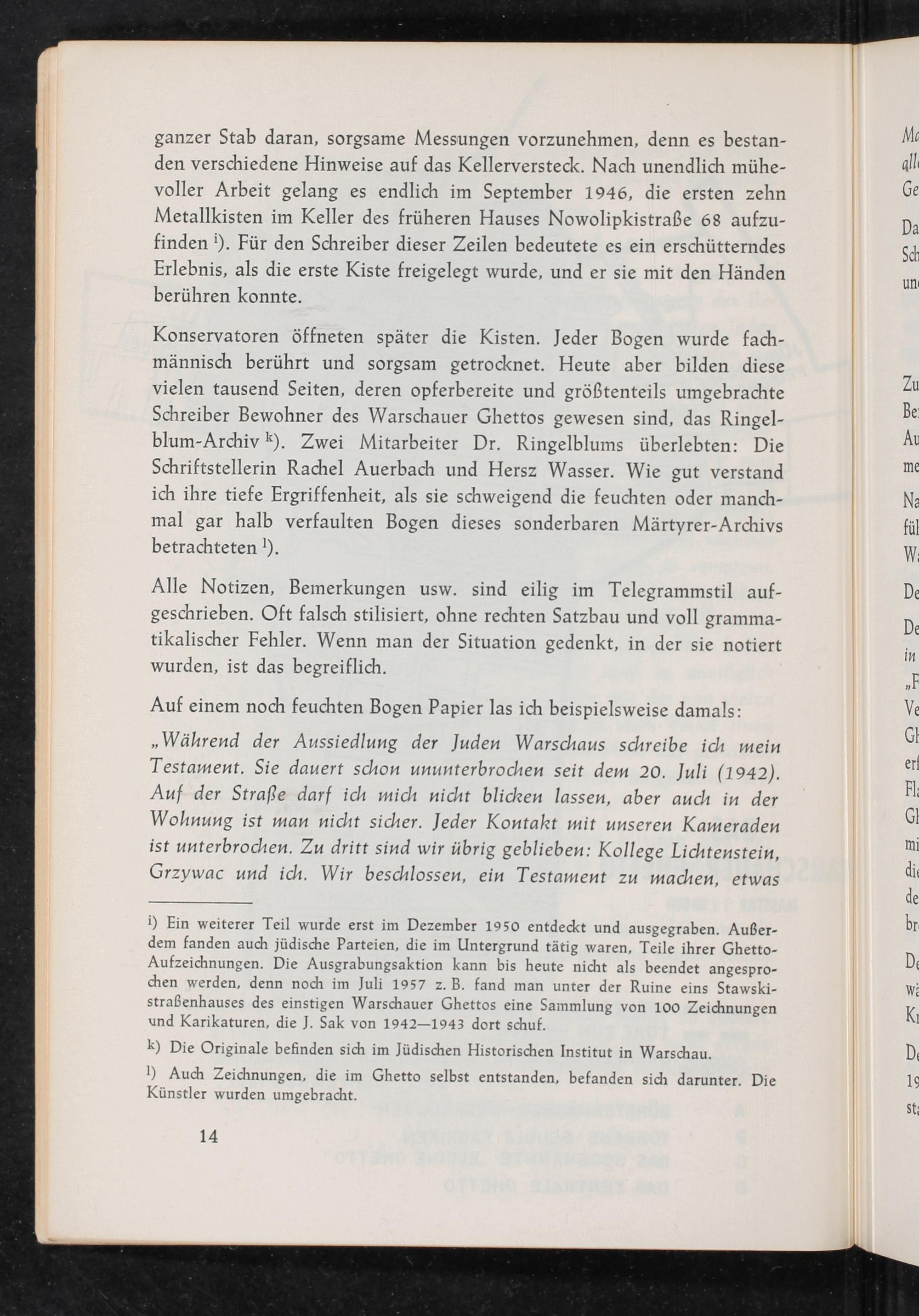 Konservatoren öffneten später die Kisten. Jeder Bogen wurde fach- männisch berührt und sorgsam getrocknet. Heute aber bilden diese vielen tausend Seiten, deren opferbereite und größtenteils umgebrachte Schreiber Bewohner des Warschauer Ghettos gewesen sind, das Ringel- blum-Archiv%). Zwei Mitarbeiter Dr. Ringelblums überlebten: Die Schriftstellerin Rachel Auerbach und Hersz Wasser. Wie gut verstand ich ihre tiefe Ergriffenheit, als sie schweigend die feuchten oder manch- mal gar halb verfaulten Bogen dieses sonderbaren Märtyrer-Archivs betrachteten)).