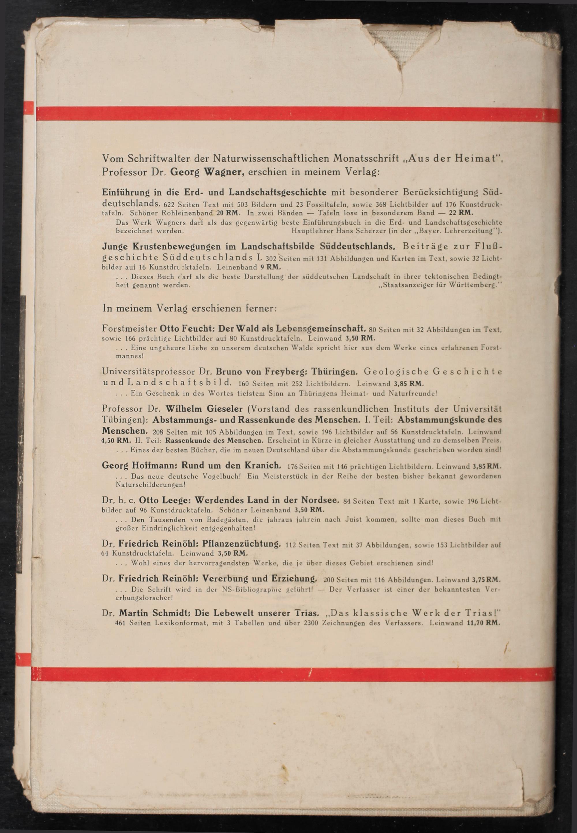 Professor Dr. Wilhelm Gieseler(Vorstand des rassenkundlichen Instituts der Universität Tübingen): Abstammungs- und Rassenkunde des Menschen, I, Teil: Abstammungskunde des Menschen, 208 Seiten mit 105 Abbildungen im Text, sowie 196 Lichtbilder auf 56 Kunstdrucktafeln. Leinwand 4,50 RM. II. Teil: Rassenkunde des Menschen. Erscheint in Kürze in gleicher Ausstattung und zu demselben Preis