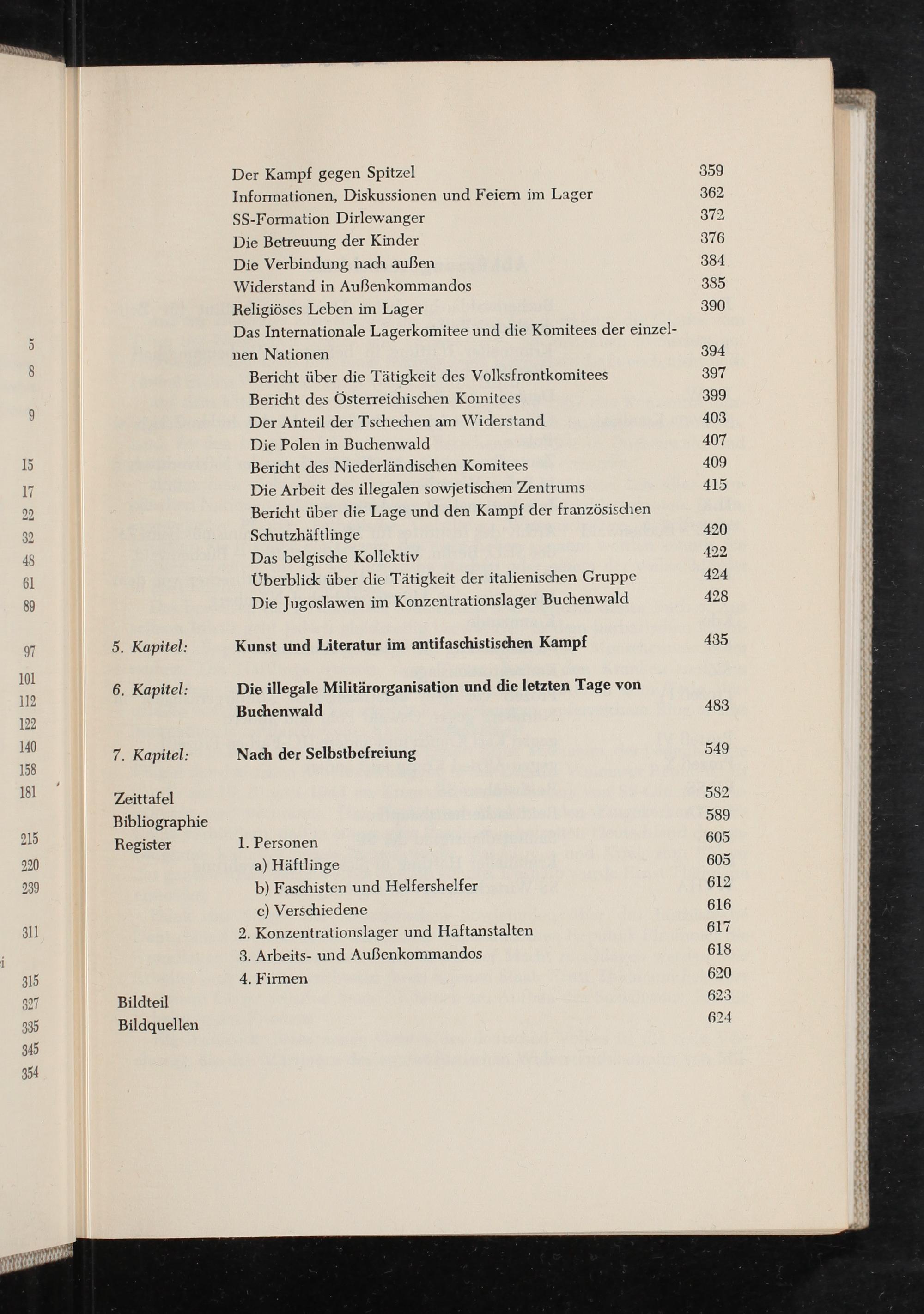 Der Kampf gegen Spitzel Informationen, Diskussionen und Feiern im Lager SS-Formation Dirlewanger Die Betreuung der Kinder Die Verbindung nach außen Widerstand in Außenkommandos Religiöses Leben im Lager Das Internationale Lagerkomitee und die Komitees der einzel- nen Nationen Bericht über die Tätigkeit des Volksfrontkomitees Bericht des Österreichischen Komitees Der Anteil der Tschechen am Widerstand Die Polen in Buchenwald Bericht des Niederländischen Komitees Die Arbeit des illegalen sowjetischen Zentrums Bericht über die Lage und den Kampf der französischen Schutzhäftlinge Das belgische Kollektiv Überblick über die Tätigkeit der italienischen Gruppe Die Jugoslawen im Konzentrationslager Buchenwald