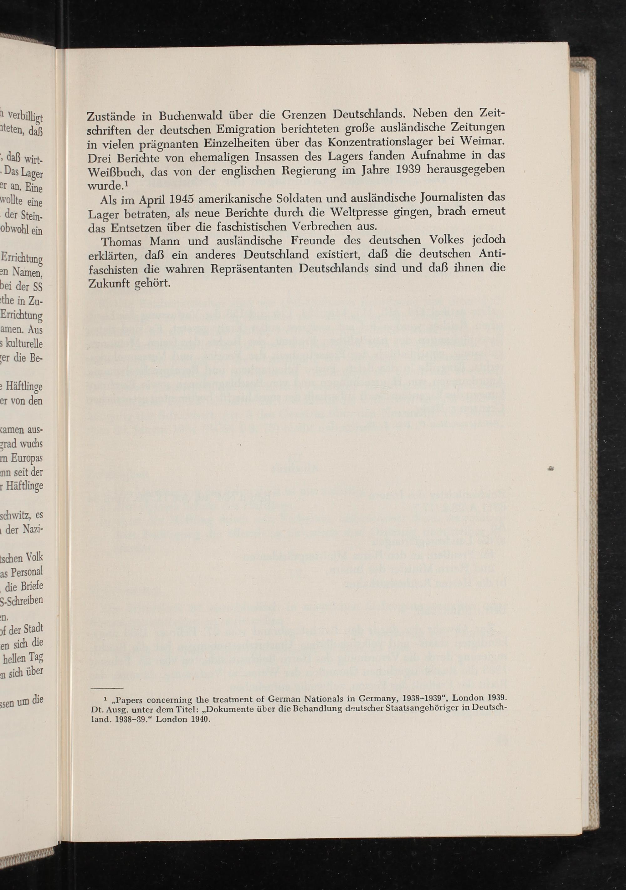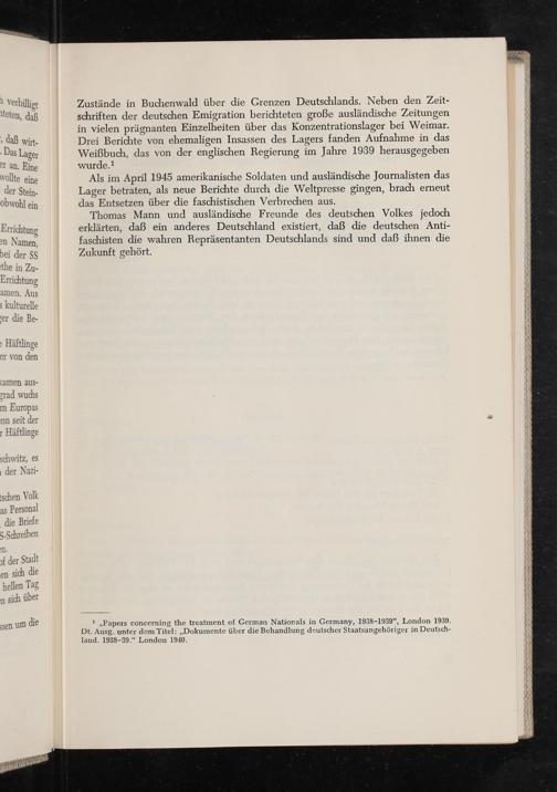 Zustände in Buchenwald über die Grenzen Deutschlands. Neben den Zeit- schriften der deutschen Emigration berichteten große ausländische Zeitungen in vielen prägnanten Einzelheiten über das Konzentrationslager bei Weimar. Drei Berichte von ehemaligen Insassen des Lagers fanden Aufnahme in das Weißbuch, das von der englischen Regierung im Jahre 1939 herausgegeben wurde.!