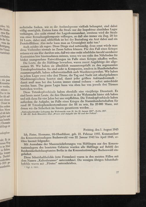 a) und sich dann für vier Jahre bei uns verpflichten. Die Totenkopfverbände haben n ven außerdem die Aufgabe, im Falle eines Krieges die Stammhundertschaften für j em rund 30 Totenkopfsondersturmbanne der SS zu sein, für 25000 Mann, mit! kon Mors denen wir die Sicherheit im Innern garantieren werden... h ıd ich habe„Nationalpolitischer Lehrgang der Wehrmacht vom 15. bis 23. Januar 1937“, Berlin 1937. Rt elöst ai S. 146-151. Rede Himmlers über„Wesen und Aufgabe der SS und der Polizei“. h ınn besteht ‚4 ; Chemnitz äftlinge ist I ne Freising, den 1. August 1945 N =) Ich, Pister, Hermann, SS-Oberführer, geb. 21. Februar 1885, Kommandant N it des Konzentrationslagers Buchenwald vom 22. Januar 1942 bis April 1945, er- Mi