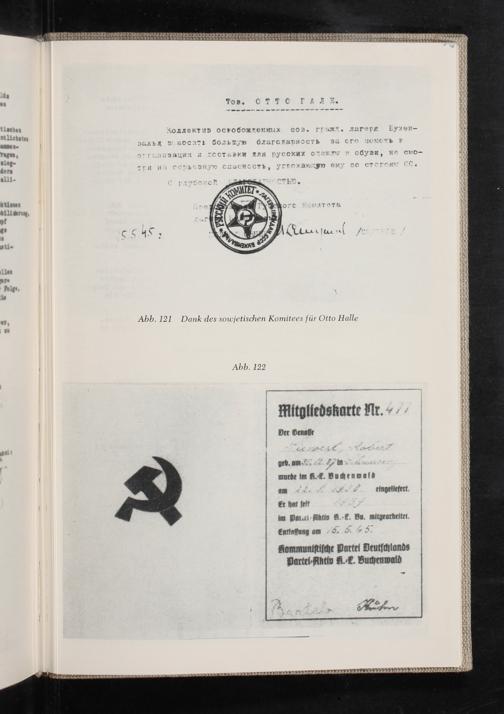 = F er CwOo- ktione lideruy pe 4@ ati» en hi is =. Abb. 121 Dank des sowjetischen Komitees für Otto Halle su Abb. 122 H I I) I) i Hl Mitgliedskarte Nr.» N F vi Ai Der Genoffe| H) geb. am... Fr ! wurde im A. Buhenwald am FL»... eingeliefert.|