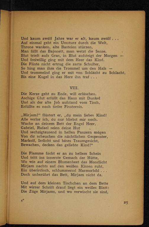 Und kaum zwölf Jahre war er alt, kaum zwölf... Auf einmal geht ein Umsturz durch die Welt, Throne wanken, alte Basteien stürzen, Man fällt das Bajonett, man wetzt die Sense.. Blut trieft aufs Gras, in Blut aufsteigt der Morgen— Und freiwillig ging mit dem Heer das Kind. Die Flinte nicht ertrug die zarte Schulter, So hing man ihm die Trommel um den Hals— Und trommelnd ging er mit von Schlacht zu Schlacht, Bis eine Kugel in das Herz ihn traf...