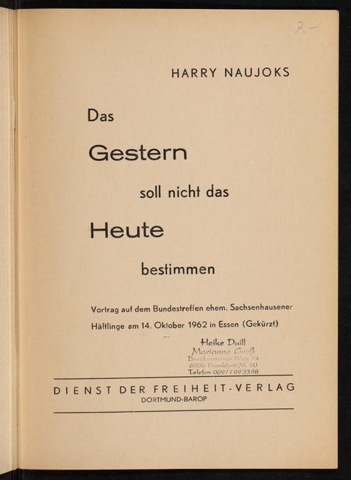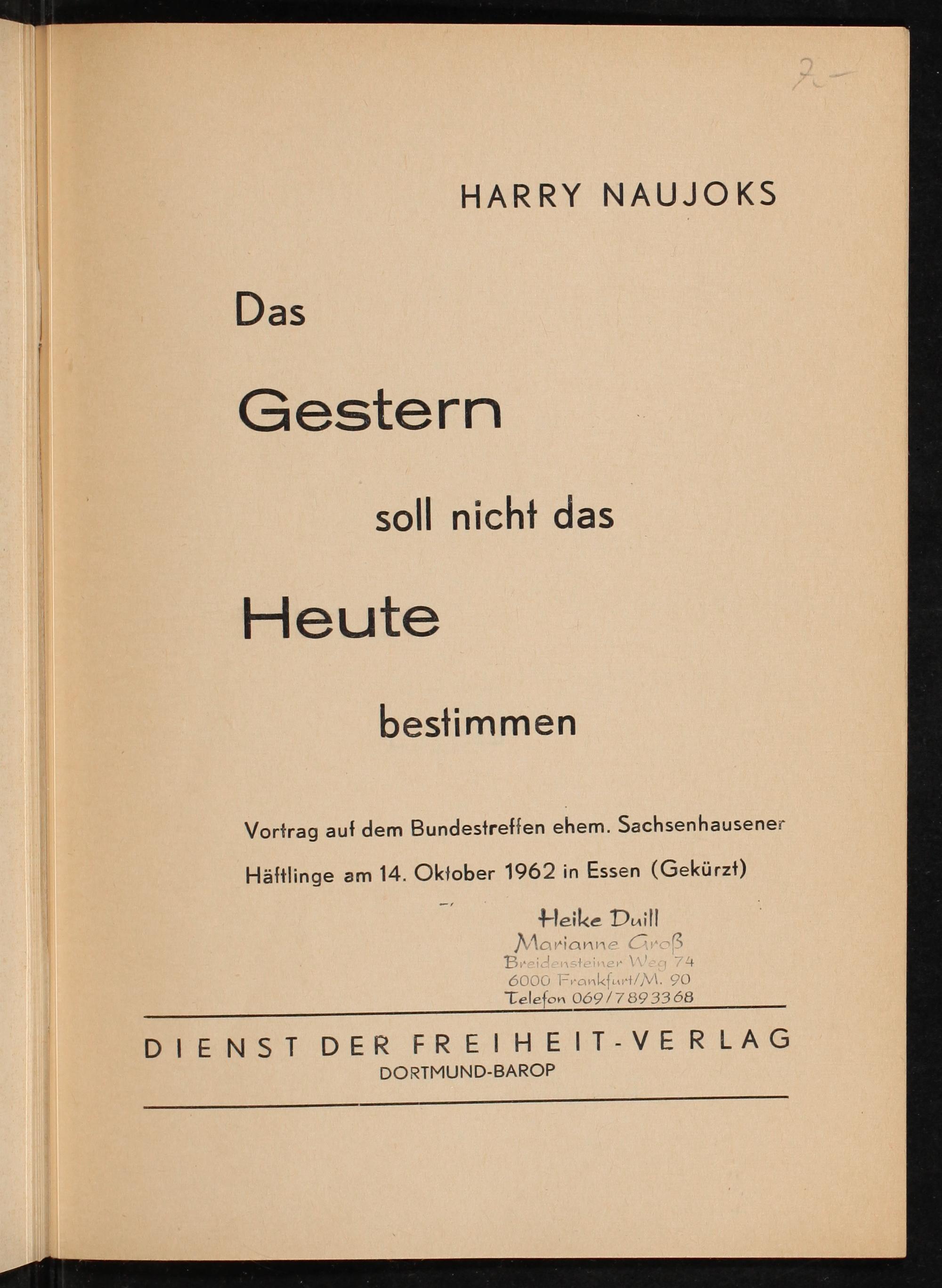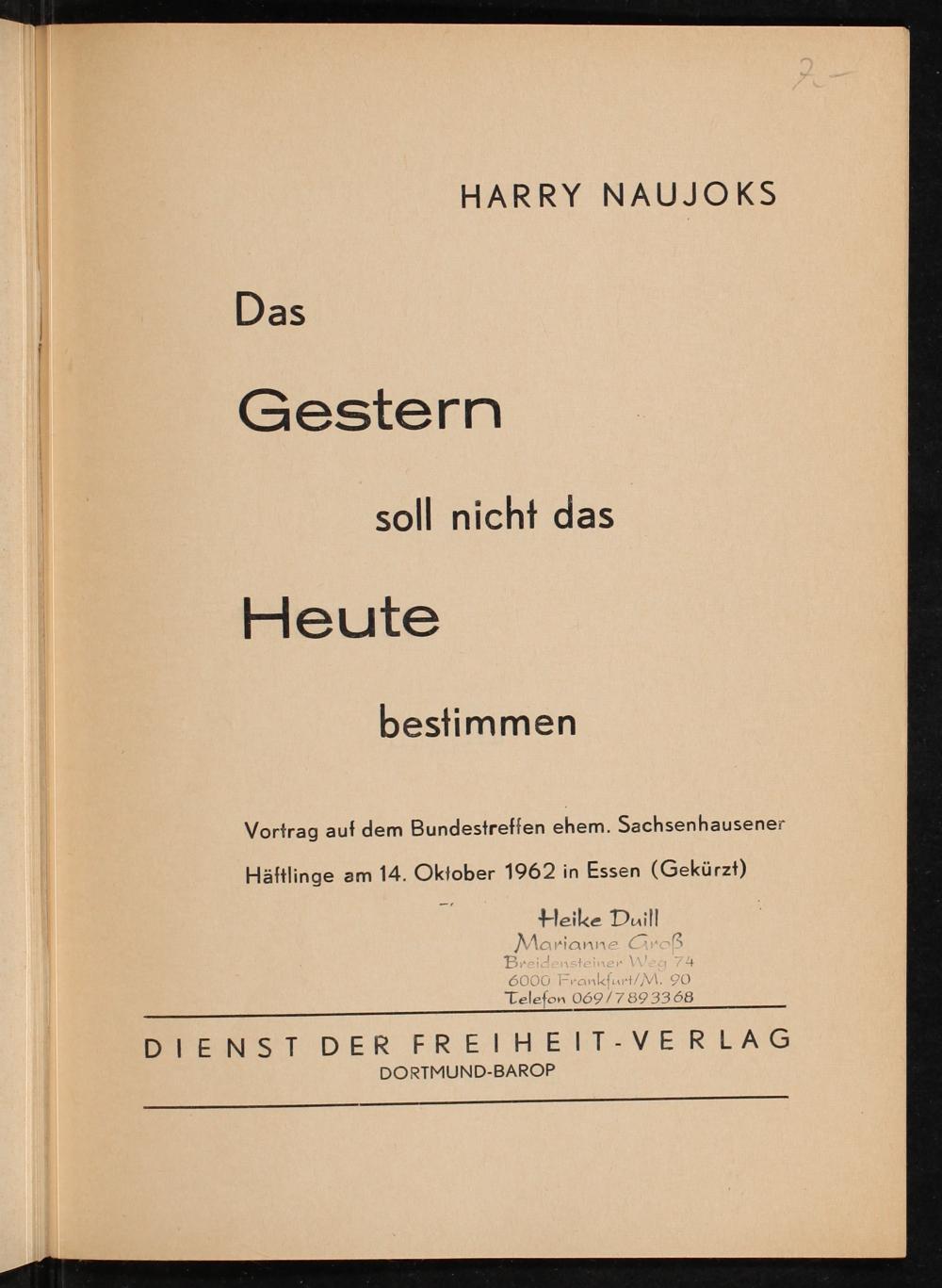 Das Gestern soll nicht das Heute bestimmen : 1945 - 1963; Vortrag auf dem Bundestreffen ehem. Sachsenhausener Häftlinge am 14. Okt. 1962 in Essen (gekürzt) / Harry Naujoks