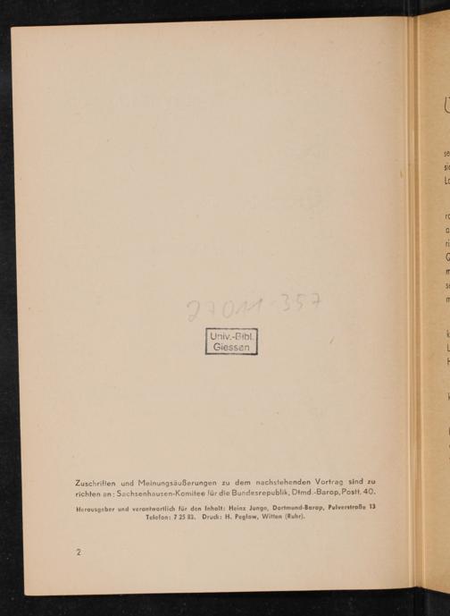Das Gestern soll nicht das Heute bestimmen : 1945 - 1963; Vortrag auf dem Bundestreffen ehem. Sachsenhausener Häftlinge am 14. Okt. 1962 in Essen (gekürzt) / Harry Naujoks