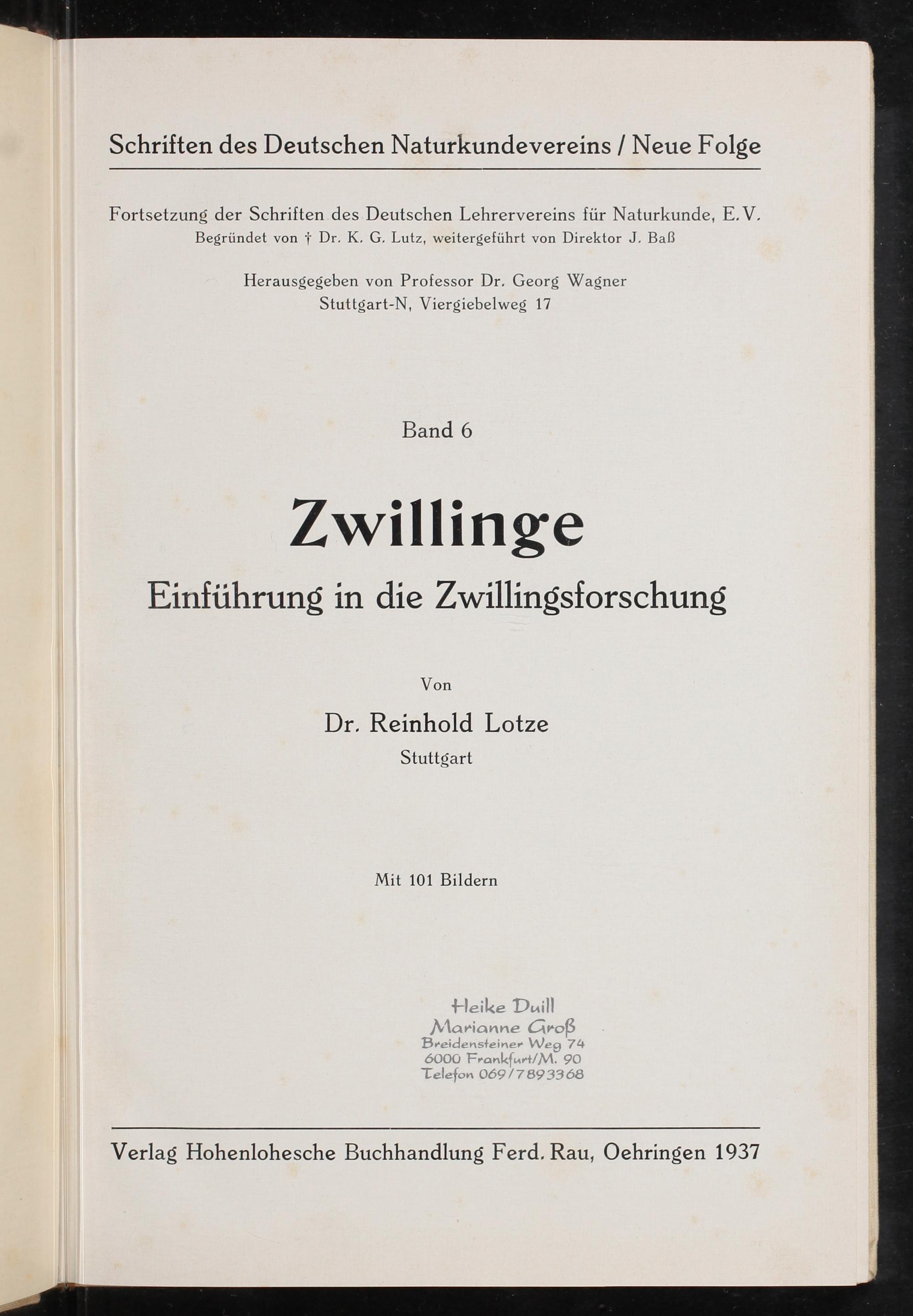 Zwillinge : Einführung in die Zwillingsforschung / von Reinhold Lotze