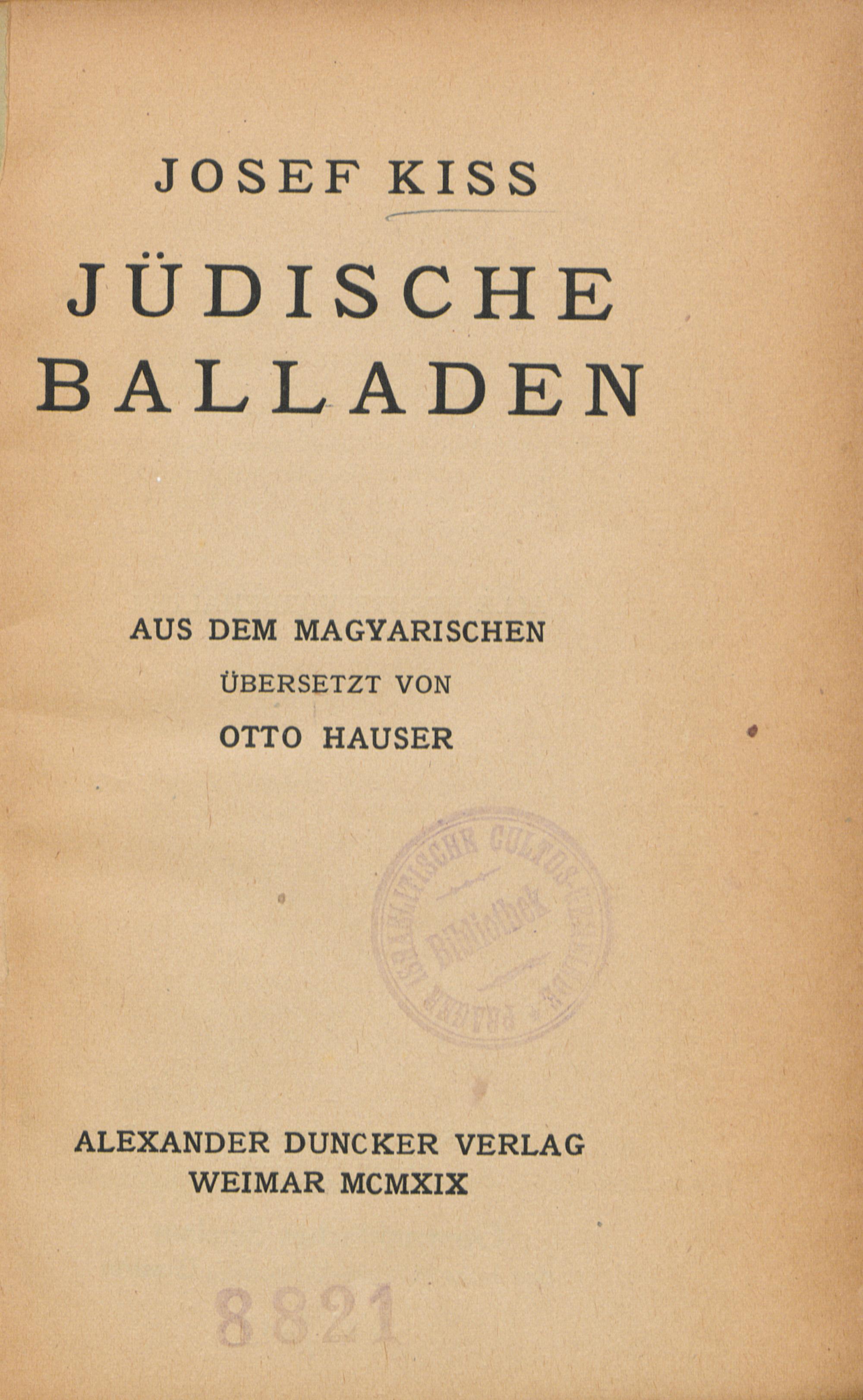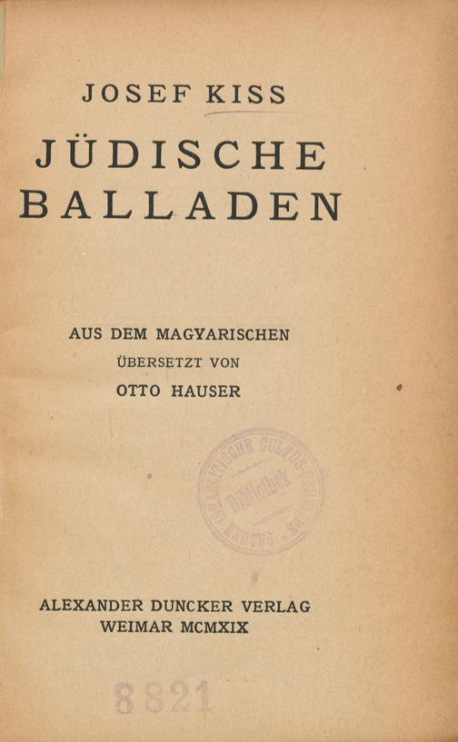 Jüdische Balladen / Josef Kiss ; aus dem Magyarischen übersetzt von Otto Hauser