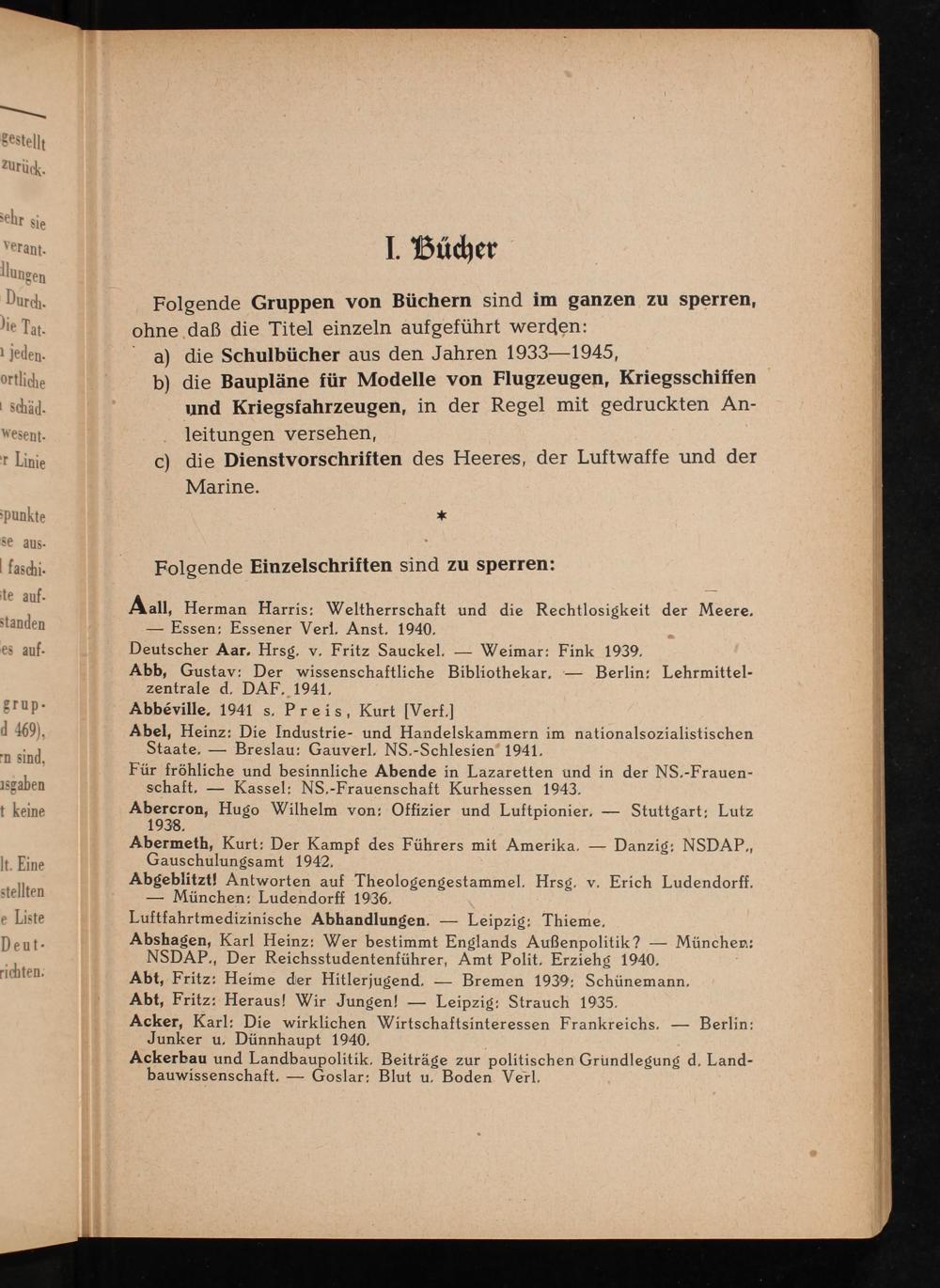 Folgende Gruppen von Büchern sind im ganzen zu Sperren, ohne daß die Titel einzeln aufgeführt werden: a) die Schulbücher aus den Jahren 1933—1945, b) die Baupläne für Modelle von Flugzeugen, Kriegsschifien und Kriegsfahrzeugen, in der Regel mit gedruckten An-