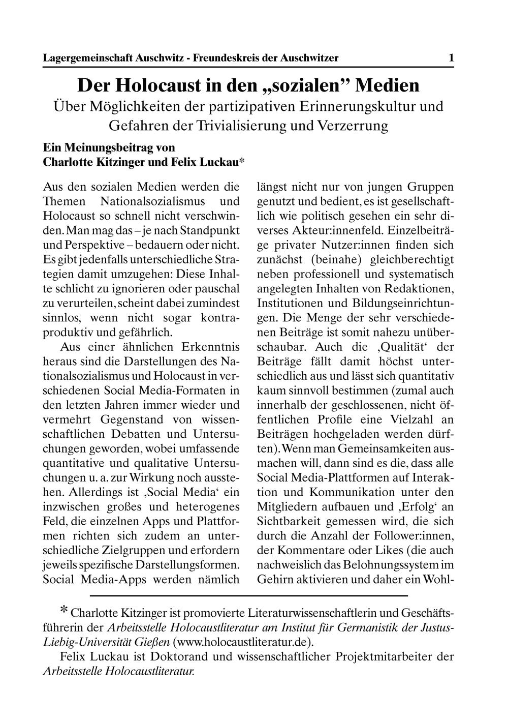 Aus den sozialen Medien werden die Themen Nationalsozialismus und Holocaust so schnell nicht verschwin- den. Man mag das— je nach Standpunkt und Perspektive= bedauern oder nicht. Es gibt jedenfalls unterschiedliche Stra- tegien damit umzugehen: Diese Inhal- te Schlicht zu ignorieren oder pauschal zu verurteilen, scheint dabei zumindest sinnlos, wenn nicht sogar kontra- produktiv und gefährlich.