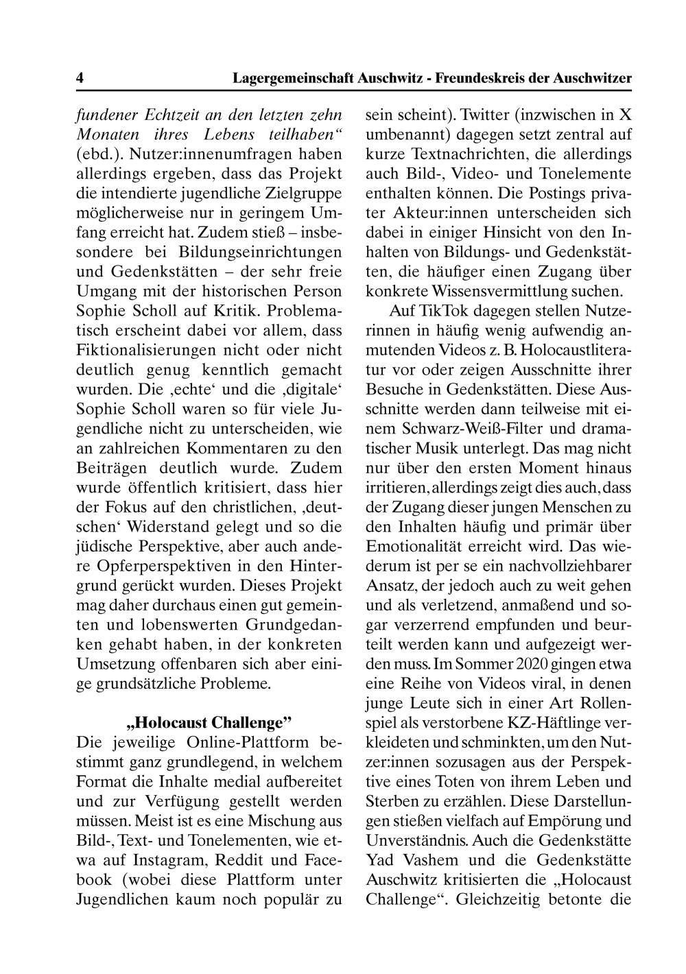 Sein scheint). Twitter(in?wischen in X umbenannt) dagegen setzt zentral auf kurze TIextnachrichten, die allerdings auch Bild-, Video- und Tonelemente enthalten können. Die Postings priva- ter Akteur:innen unterscheiden sich dabei in einiger Hinsicht von den In- halten von Bildungs- und Gedenkstät- ten, die häufiger einen Zugang über konkrete Wissensvermittlung suchen. Auf Tik Tok dagegen stellen Nutze- rinnen in häufig wenig aufwendig an- mutenden Videos z. B. Holocaustlitera- tur vor oder zeigen Ausschnitte ihrer Besuche in Gedenkstätten. Diese Aus- Schnitte werden dann teilweise mit ei- nem Schwarz-Weiß-FHilter und drama- tischer Musik unterlegt. Das mag nicht nur über den ersten Moment hinaus irritieren, allerdings Zeigt dies auch, dass der Zugang dieser jungen Menschen zu den Inhalten häufig und primär über Emotionalität erreicht wird. Das wie- derum ist per se ein nachvolkiehbarer Ansat?, der jedoch auch zu weit gehen und als verletzend, anmaßend und so- gar verzerrend empfunden und beur- teilt werden kann und aufgezeigt wer- den muss. Im Sommer 2020 gingen etwa eine Reihe von Videos viral, in denen junge Leute sich in einer Art Rollen- Spiel als verstorbene KZHäftlinge ver- kleideten und schminkten, um den Nut- zer:innen sozusagen aus der Perspek- tive eines Toten von ihrem Leben und Sterben zu erzählen. Diese Darstellun- gen stießen vieffach auf Empörung und Unverstãndnis. Auch die Gedenkstãtte vVad Vashem und die Gedenkstätte Auschwitz kritisierten die„Holocaust Challenge“. Gleichzeitig betonte die