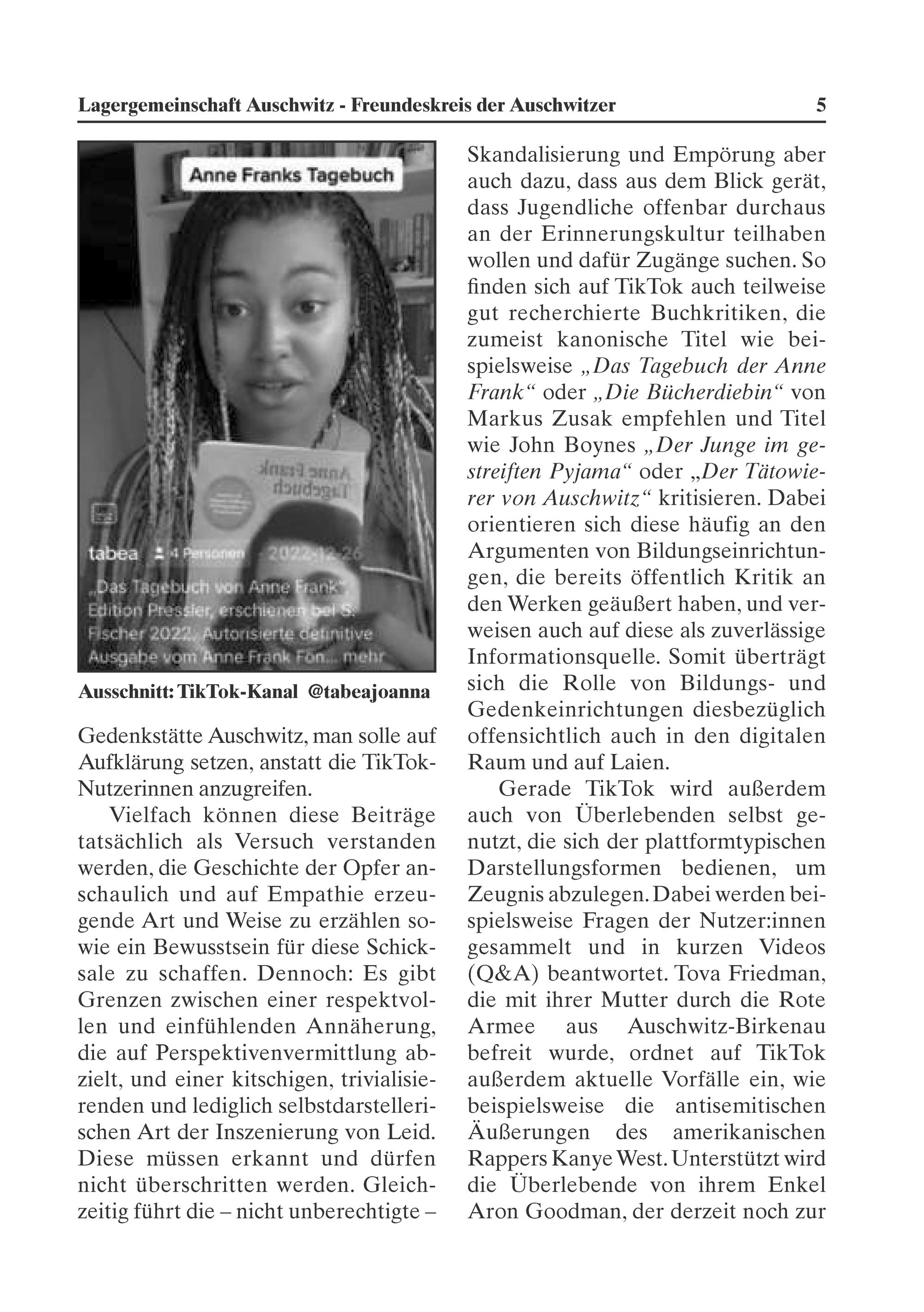 Skandalisierung und Empörung aber auch dazu, dass aus dem Blick gerät, dass Jugendliche offenbar durchaus an der Brinnerungskultur teilhaben wollen und dafür Zugänge suchen. S0 finden sich auf TikTok auch teilweise gut recherchierte Buchkritiken, die zumeist kanonische Titel wie bei— Spielsweise„Dds Jagebuch der Anne Frank“ oder„Die Bücherdiebin“ von Markus Zusak empfehlen und Titel wie John Boynes„Der Munge im ge— treiften Pyjama“ oder„Der Tdtowie— rer von Alschwitz“ kritisieren. Dabei orientieren sich diese häufig an den Argumenten von Bildungseinrichtun- gen, die bereits öffentlich Kritik an den Werken geäußert haben, und ver- weisen auch auf diese als zuverlässige Informationsquelle. Somit überträgt sich die Rolle von Bildungs- und Gedenkeinrichtungen diesbezüglich offensichtlich auch in den digitalen Raum und auf Laien.