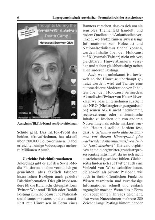 Geziehlte Falschinformationen Allerdings gibt es auf den Social- Me- dia-Plattformen neben vermutlich gut gemeinten, aber faktisch falschen historischen Bezügen auch gezielte Falschinformation. Dies gilt insbeson- dere für die Kurznachrichtenplattform Twitter: Während Tik Tok oder Reddit Postings Zum Holocaust und National- Sozialismus meistens und automati- siert mit Hinweisen in Form eines