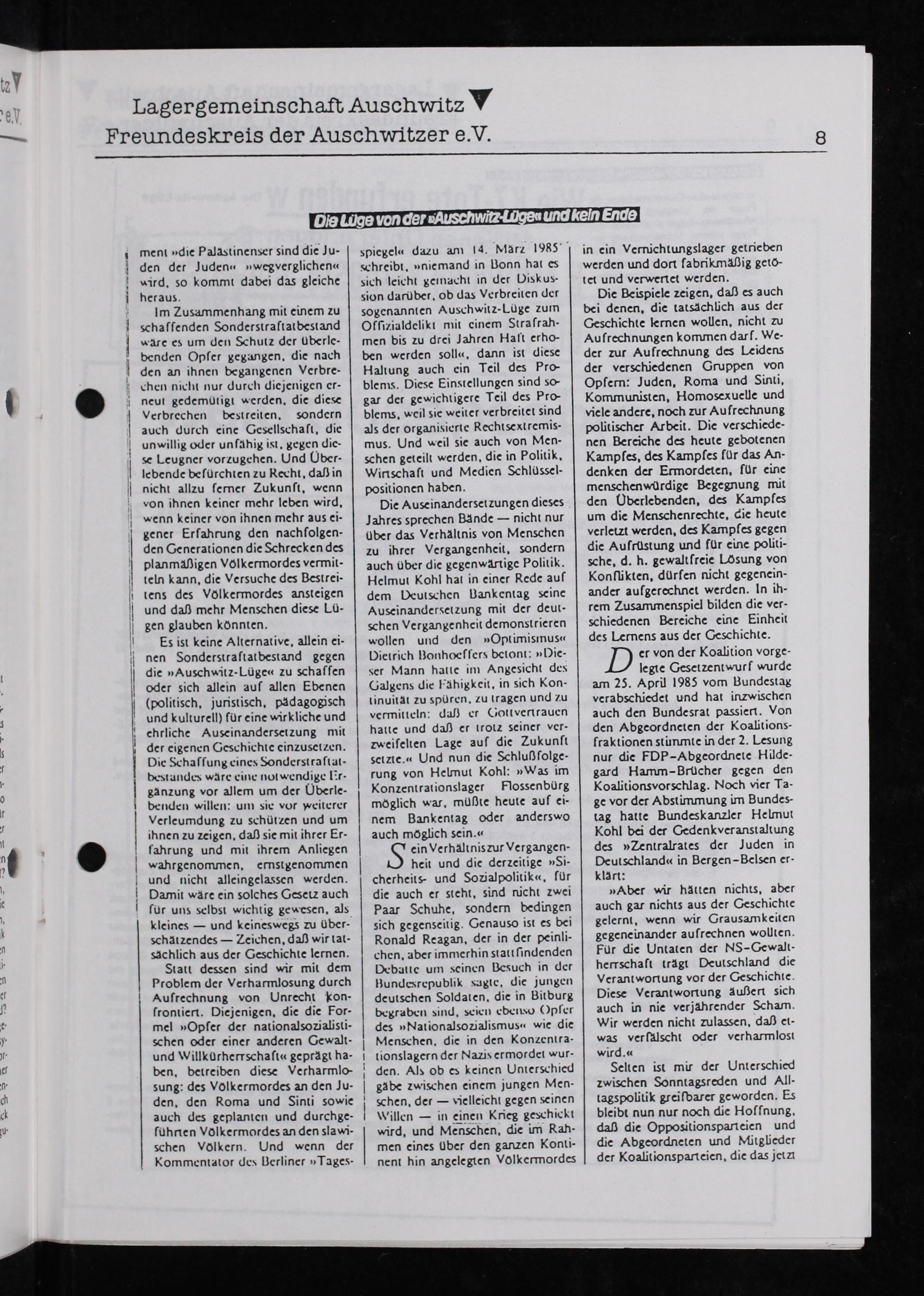 Es ist keine Alternative. allein ei- nen Sonderstraſtatbestand gegen die»Auschwitz-Lüge“ zu schafſen oder sich allein auf allen Ebenen (Politisch, juristisch. padagogisch und kulturell) fur eine wirkliche und chrliche Auseinandersetzung mit der eigenen Geschichie einzusetzen. Die Schaſſunt eines Sonderstraſiut- besundes vre eine notwendige l?r- ganzung vor allem um der Uberle- benden willen: um sie vor weiterer Verleumdung zu schütxen und um ihnen zu zeigen. daß sie mit ihrer Er- fahrung und mi ihrem Anliegen vahrgenommen. ernstgenommen und nicht alleingelassen werden. Damit vare ein solches Geset auch ſur uns selbsi wichtig gewesen. als kleines— und keineswegs zu Uber- schatzendes— Zeichen. dah wir tat- Schlich aus der Geschichite lernen.