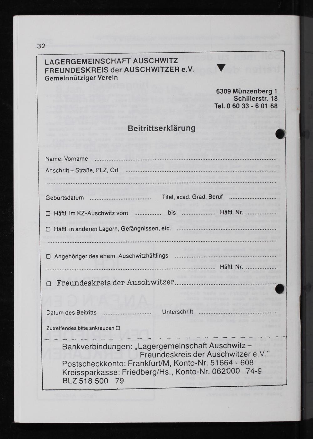 Freundeskreis der Auschwitzer e.V.“ Postscheckkonto: FrankturM, Konto-Nr. 51664— 608 Kreissparkasse: Friedberg/His., Konto-Nr. 062000 74.9 SZ518