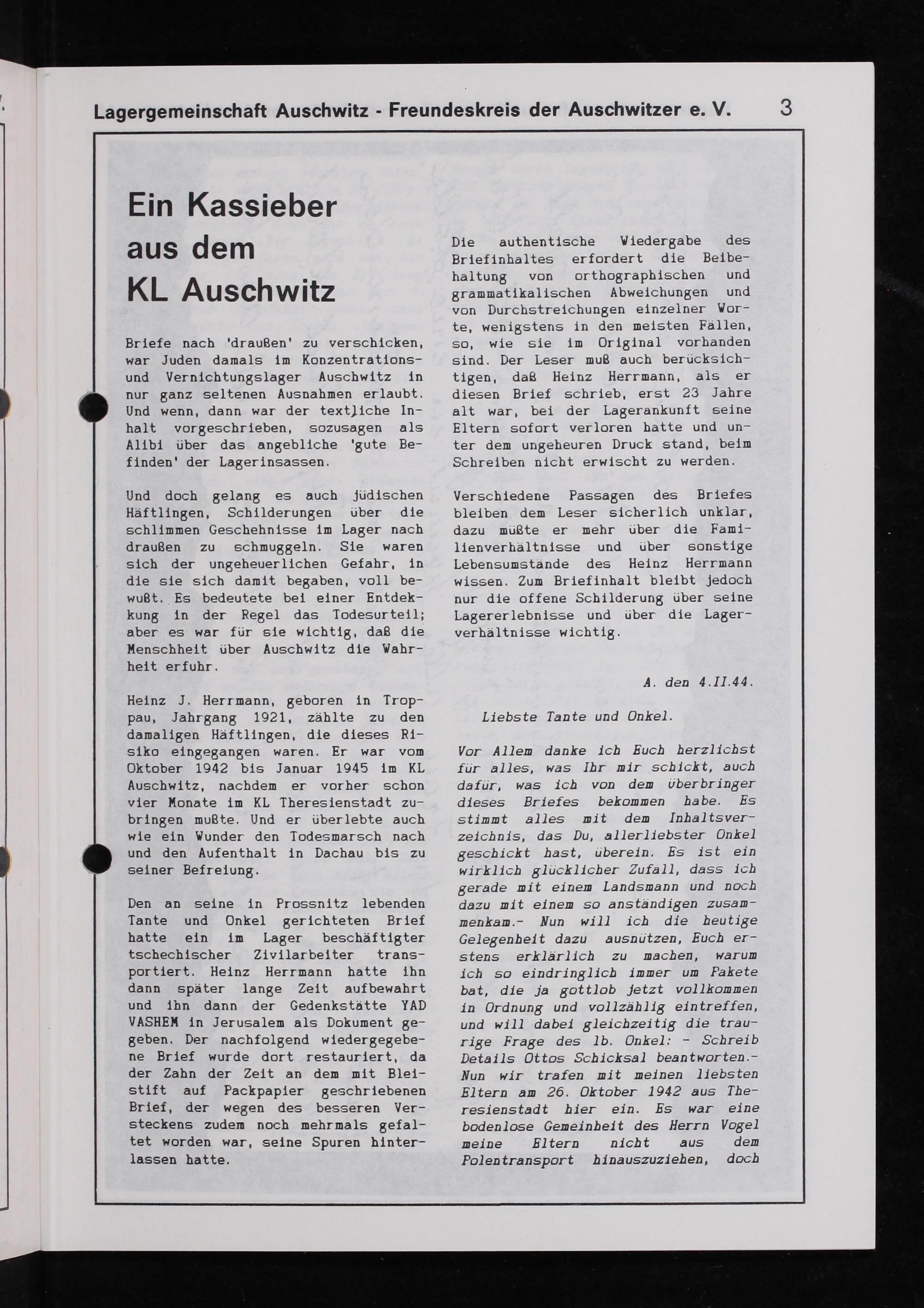 Heinz J. Herrmann, geboren 1n Trop- pau, Jahrgang 1921, zählte zu den danaligen Haftlingen, die dieses Ri- stko eingegangen varen. Er var vom Oktober 1942 bis Januar 1945 1m KI. Auschwtz, nachdem er vorher schon vler Monate im KL. Theres ienstadt zu- bringen muBte. Und er öberlebte auch vle ein Vunder den Todesmarsch nach und den Aufenthalt 1n Dachau bis zu selner Befrelung.