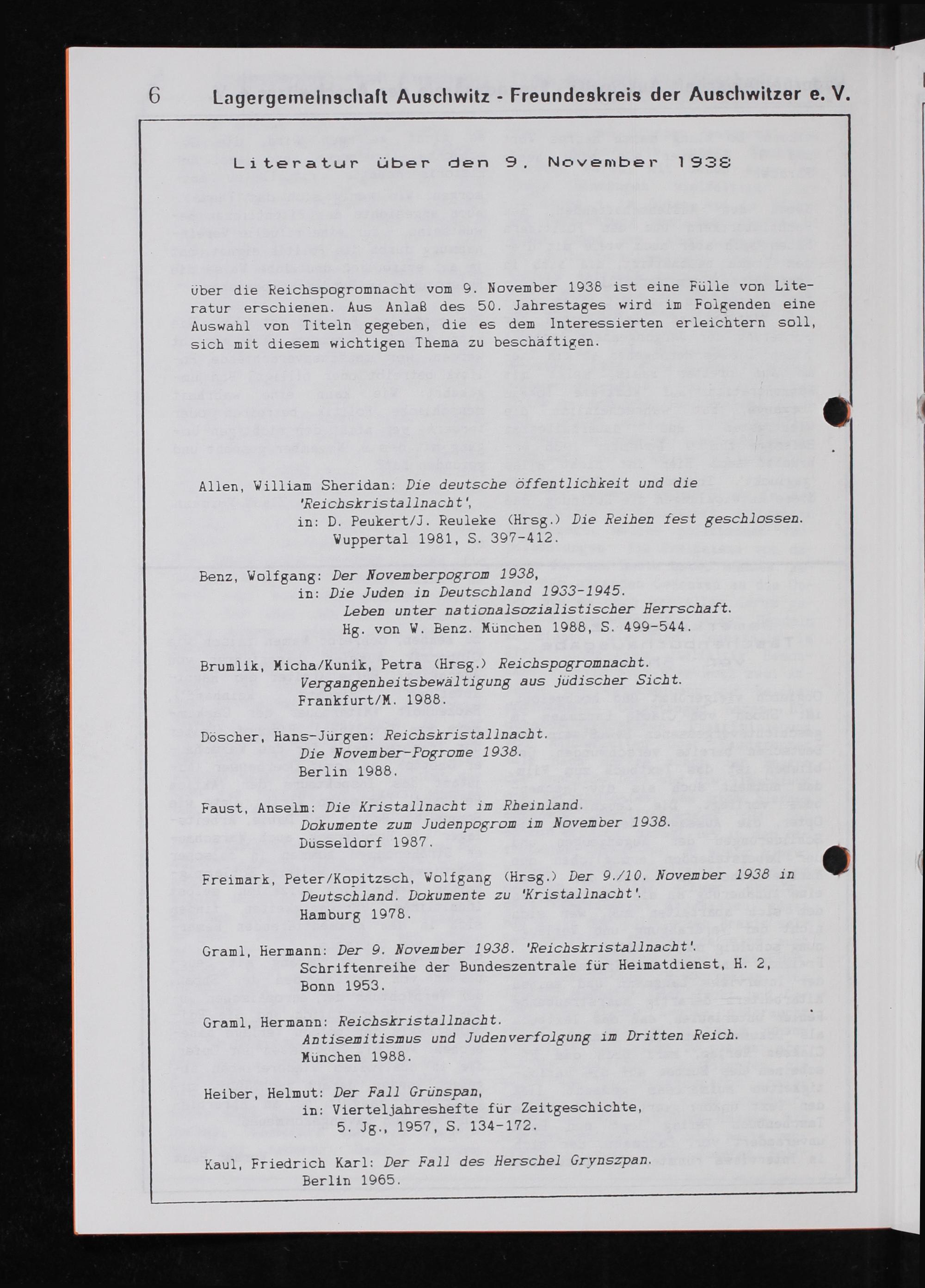 Granl, Hernann: Der 9. Vovenber 1936. KeichsKristanacht“ Schriftenreihe der Bundeszentrale für Heinatdienst, H. 2, Bonn 1953.