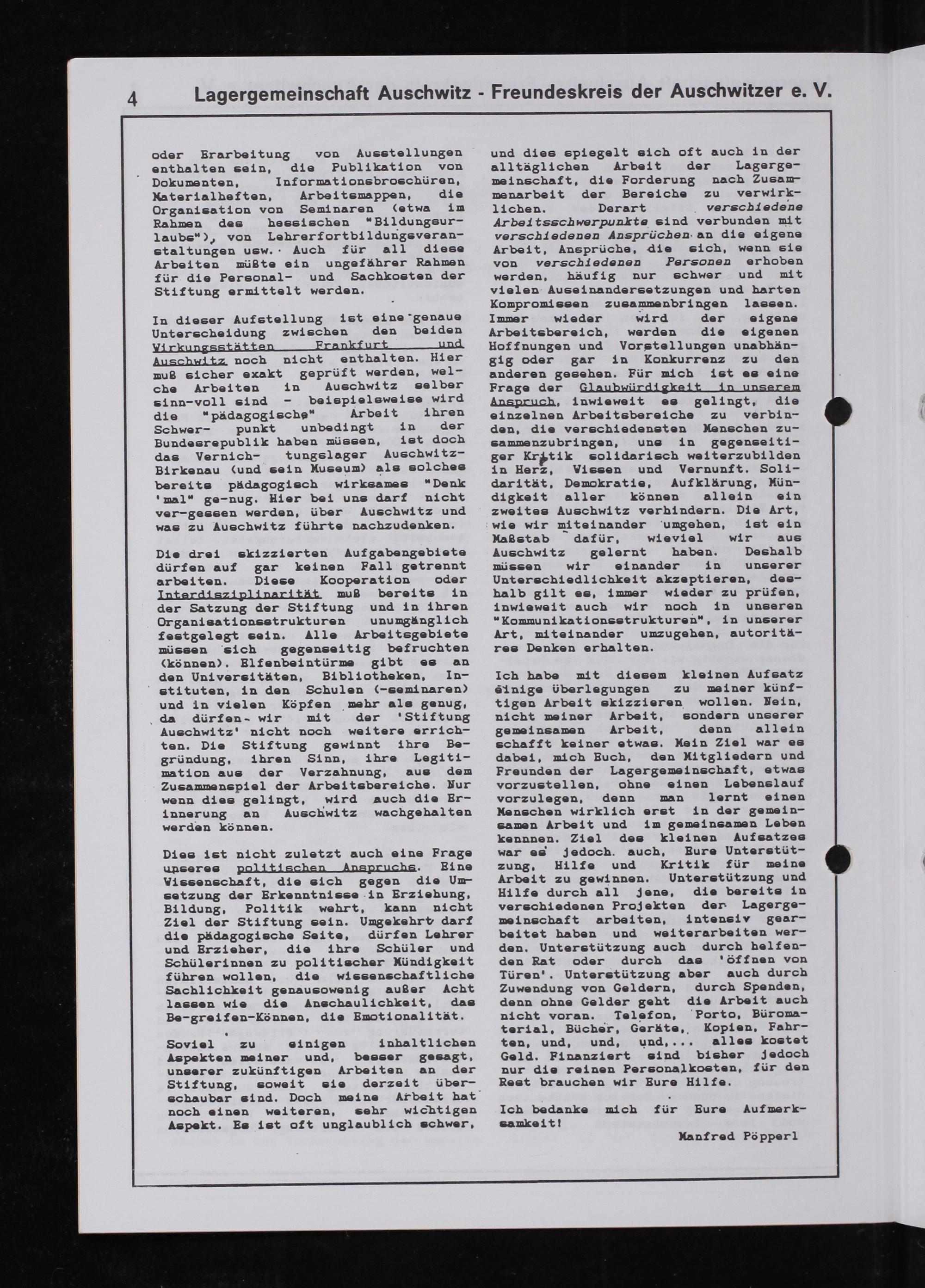 In dteser AufstelLung 18t etne genaue Unterschetdung zwtschen den betden XLTkungsRt.ätLen. Frxankf.unt. und. AuschLæ noch ntcht enthalten. Her muß s1cher exakt geprüft verden, ve1— che Arbetten 1n Auschttz se1ber s1nn- vo11 s1nd— betsptelsretse vrd die*padagogischs“ Arbett Lhren Schwer- punkt unbedingt 1n der Bundesrepub11k haben müssen, 18t doch das Verntch- tungslager Auschvi tz- BLrkanau(und se1n Huseum) a1s so1ches berette pKdagogtsch v1rkames»Denk ma1“ ge-nug. Her bel uns darf n1cht ver- gessen verden, öüber Auschw tz und vas zu Auschwitz föührte nachzudenken.