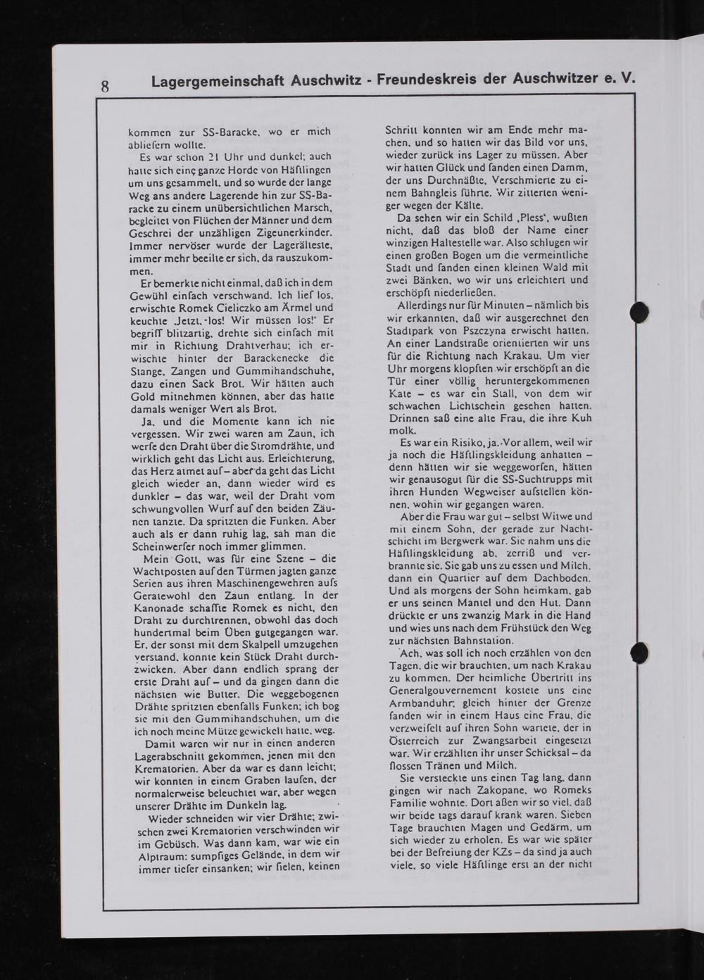 Sie versteckie uns einen Tag lang. dann gingen wir nach Zakopane. wo Romeks Familie wohnie. Dort aßen wir so viel. daß wir beide iags darauf krank waren. Sieben Tage brauchten Magen und Gedärm. um sich wieder zu erholen. Es war wie spãier bei der Beſreiung der KZs— da sind ja auch viele. so viele Häſilinge erst an der nicht