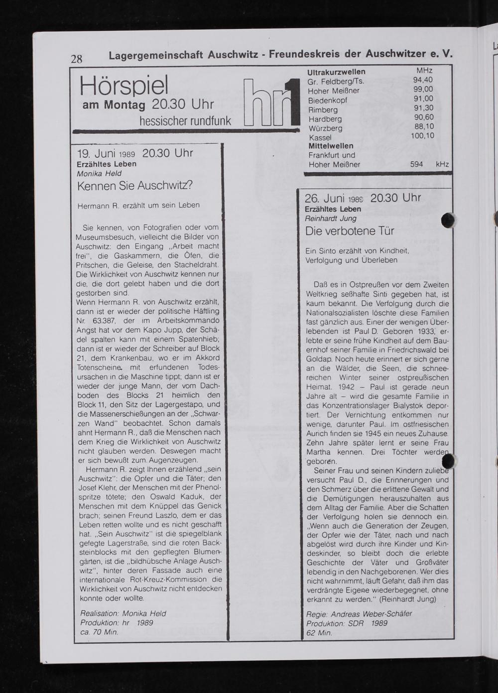 28 Lagergemeinschaft Auschwitz-Freundeskreis der Auschwitzer e. V. .„ Uitrakurzwellen MHz H S Gr. Feldberg/Is. 94,40 O S5 Hoher Meißner 99,00 Biedenkopf 91,00 W 2030 Uhr Bimberg 91,30 nessischer rundfunk piarcderg 90.60 Würzberq 88,10 Kasse 100,10 Mittelwellen 19. Juni 036 2030 Uhr Eie Erzähltes Leben ſic ſ 504 kk
