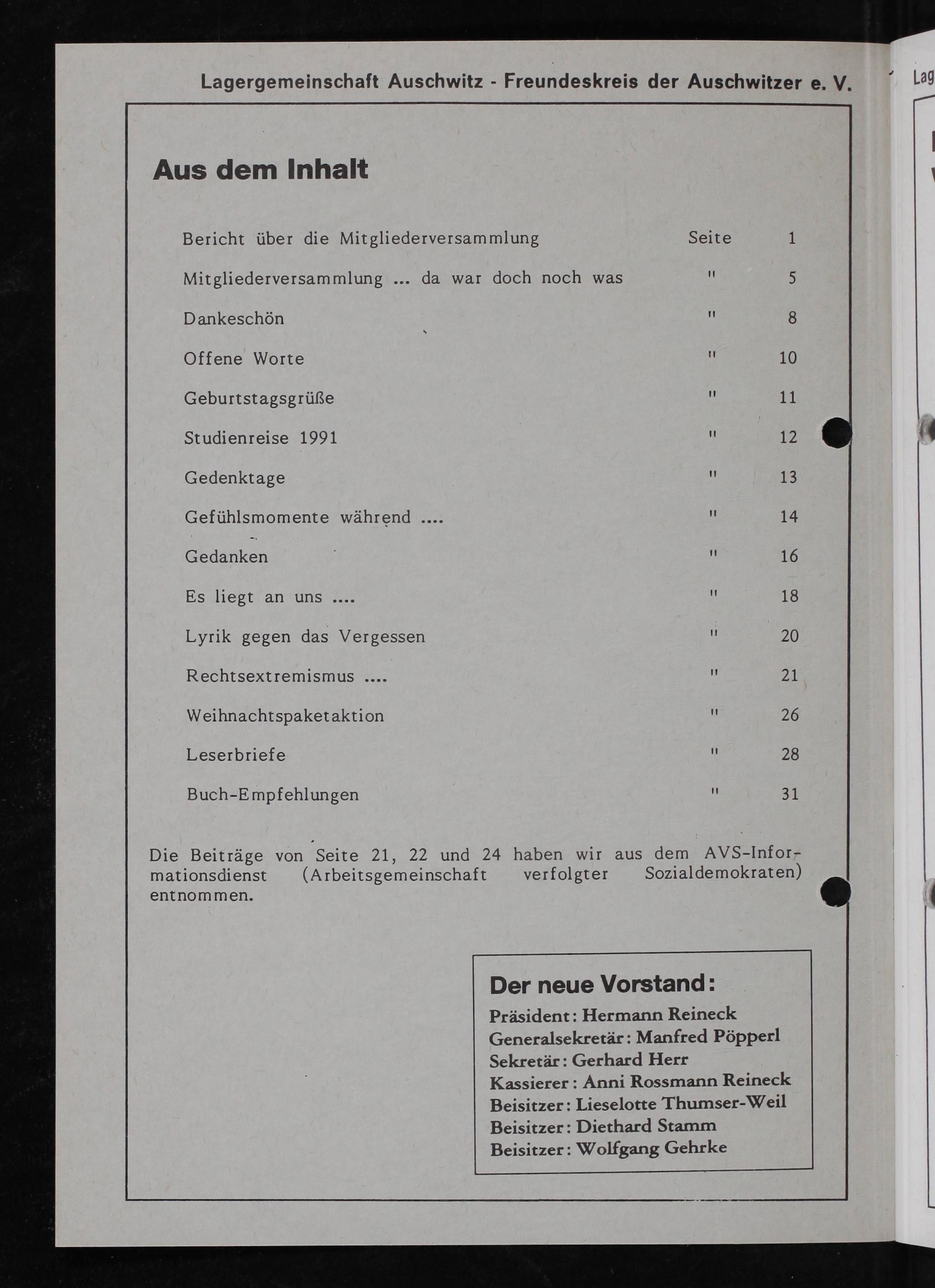 Bericht über die Mitgliederversammlung Seite 1 Mitgliederversammlung da war doch noch was 4 5 Dankeschön 4 8 Offene Worte 10 Geburtstagsgrüße 11 Studienreise 1991 1 12 E Gedenktage 18 Gefühlsmomente während. 14 S 16 Es liegt an uns. 18 Lyrik gegen das Vergessen 1 20 Rechtsextremismus.. 21 Weihnachtspaket aktion 4 26 Leserbriefe 1 28 Buch-Empfehlungen 2 30