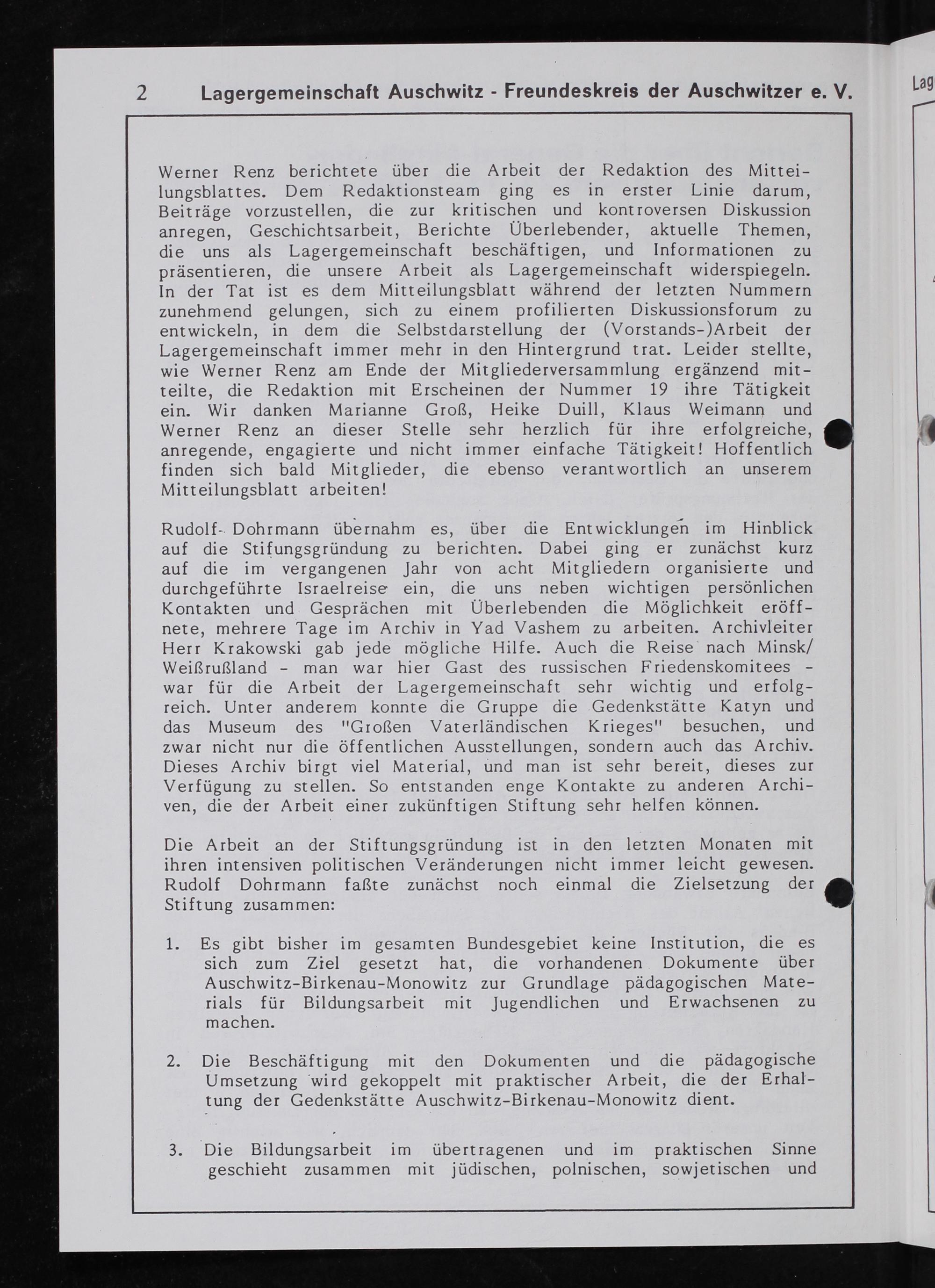 Rudolf. Dohrmann übernahm es, über die Entwicklungen im Hinblick auf die Stifungsgründung zu berichten. Dabei ging er zunächst kurz auf die im vergangenen Jjahr von acht Mitgliedern organisierte und durchgeführte Israelreise ein, die uns neben wichtigen persönlichen Kontakten und Gesprächen mit Uberlebenden die Möglichkeit eröff- nete, mehrere Tage im Archiv in vad Vashem zu arbeiten. Archivleiter Herr Krakowski gab jede mögliche Hilfe. Auch die Reise nach Minsk/ Weißrußland- man war hier Gast des russischen Friedenskomitees— war für die Arbeit der Lagergemeinschaft sehr wichtig und erfolg- reich. Umer anderem konnte die Gruppe die Gedenkstätte Katyn und das Museum des»Großen Vaterländischen Krieges“ besuchen, und zwar nicht nur die öffentlichen Ausstellungen, sondern auch das Archiv. Dieses Archiv birgt viel Material, und man ist sehr bereit, dieses zur Verfügung zu stellen. S0 entstanden enge Kontakte zu anderen Archi- ven, die der Arbeit einer zukünftigen Stiftung sehr helfen können.