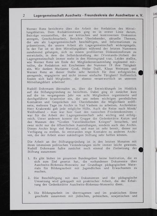 1. Es gibt bisher im gesamten Bundesgebiet keine Institution, die es sich zum Ziel gesetzt hat, die vorhandenen Dokumente über Auschwitz-Birkenau-Monowitz zur Grundlage pädagogischen Mate- rials für Bildungsarbeit mit Jugendlichen und Erwachsenen 2u machen.
