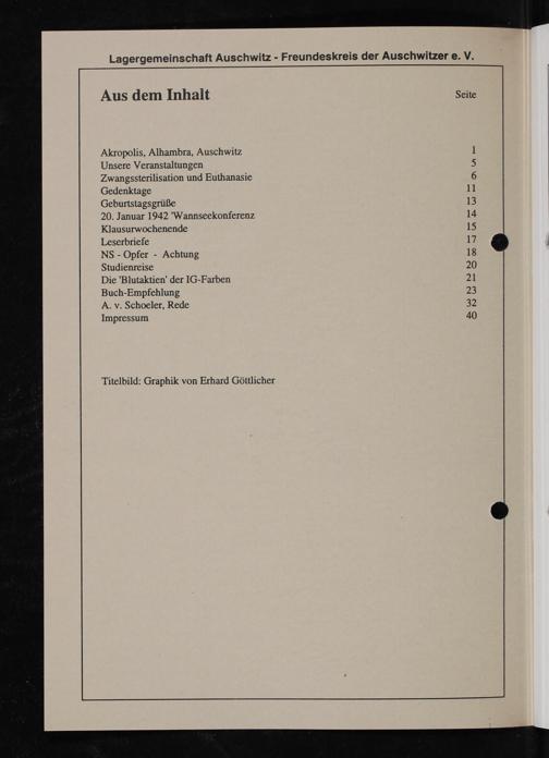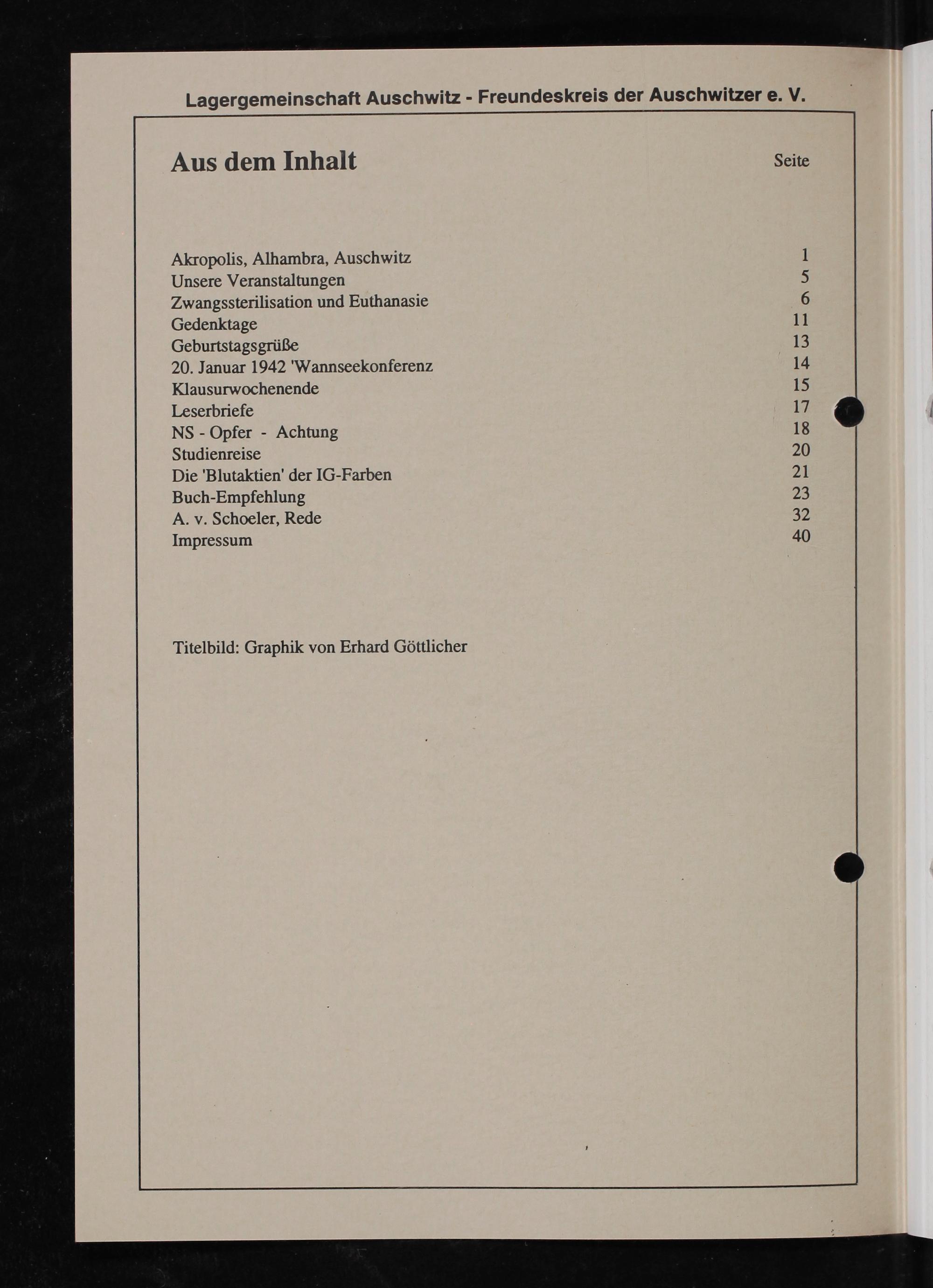 Aus dem Inhalt Seite Akropolis, Alhambra, Auschwitz 1 Unsere Veranstaltungen 5 Zwangssterilisation und Euthanasie 6 Gedenktage 11 Geburtstagsgrüße 13 20. Januar 1942 Wannseekonferenz 14 Klausurwochenende 15 Leserbriefe 17 NS Opfer- Achtung 18 Studienreise 20 Die Blutaktien' der IG-Farben 21 Buch-Empfehlung 2⁸ A. v. Schoeler, Rede 82 Impressum 40