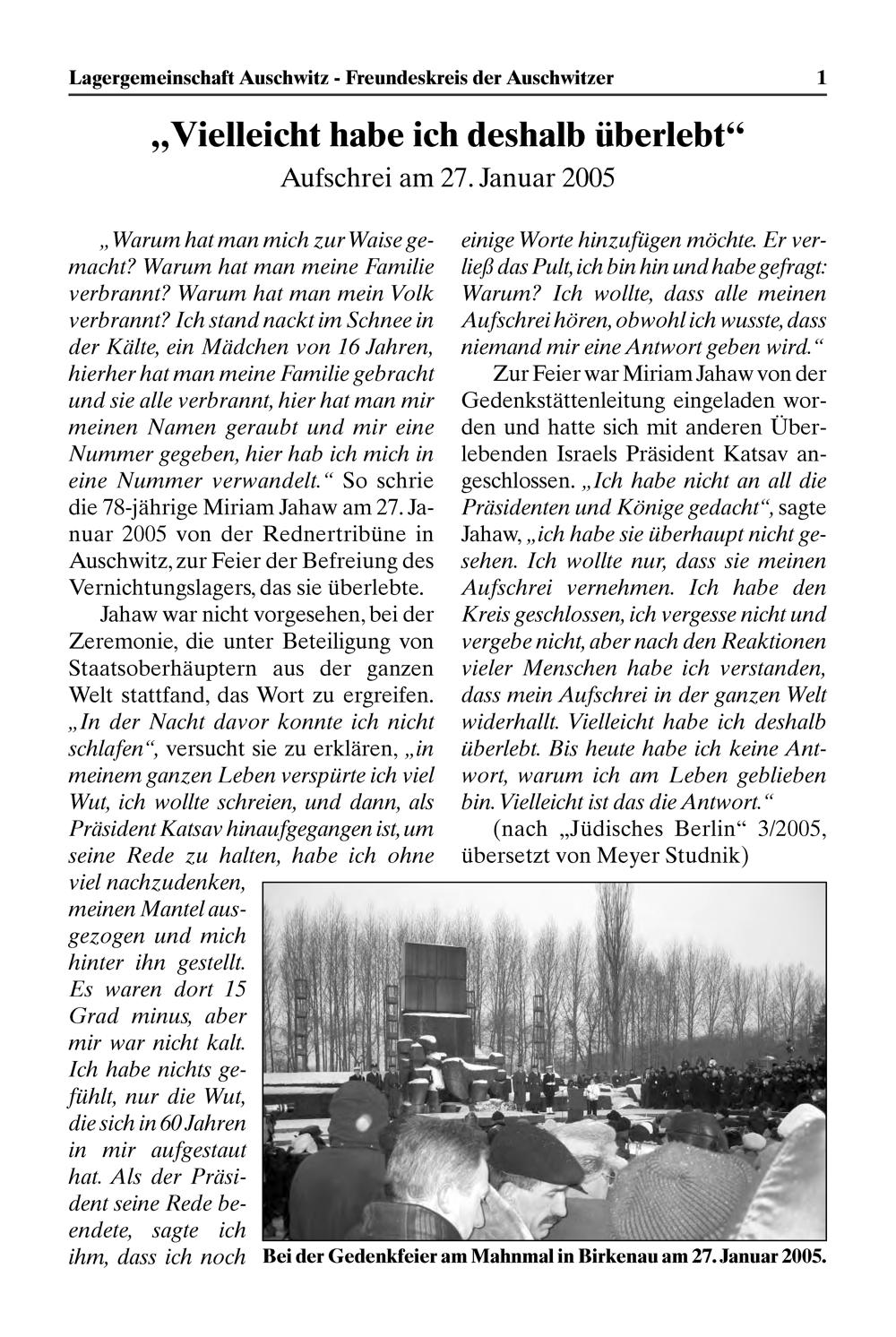 „Warum hat man mich zur Waise ge- macht? Warum hat man meine Familie verbrannt? Warum hat man mein Volk verhrannt? Ich Stund nacikt im Schnee in der Kdilte, ein Mddchen von 16 Jahren, hierner hat man meine Hamilie gebracht und vie alle verbrannt hier hat man mir meinen Mamen geraubt und mir eine Nummer gegeben, hier hab ich mich in eine Nummer verwandelt.“ So schrie die 78 jährige Miriam Jahaw am 27. Ja- nuar 2005 von der Rednertribüne in Auschwitz, Zur Feier der Befreiung des Vernichtungslagers, das sie überlebte.