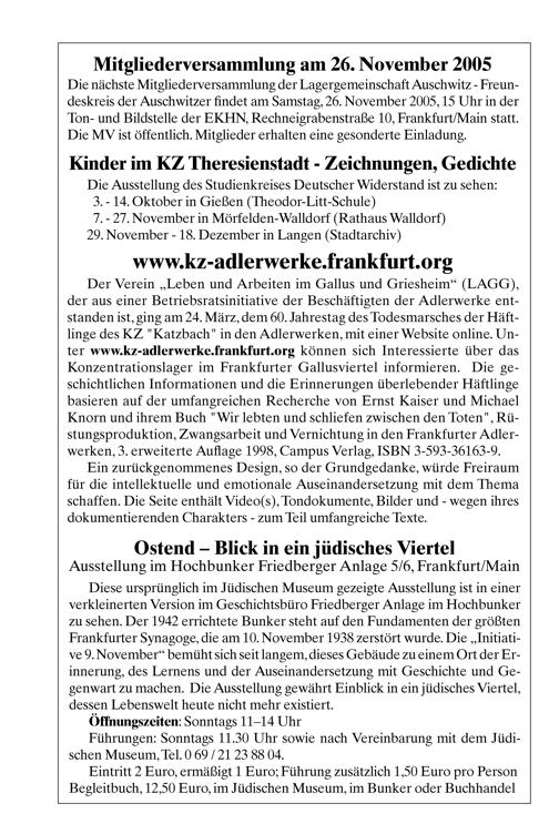 Mitgliederversammlung am 26. November 2003 Die nãchste Mitgliederversammlung der Lagergemeinschaft Auschwit?-Freun- deskreis der Auschwitzer findet am Samstag, 26. November 2005, 15 Uhr in der Jon- und Bildstelle der EKHN, Rechneigrabenstraße 10, Frankfurt/ Main statt. Die MV ist õffentlich. Mitglieder erhalten eine gesonderte Einladung.