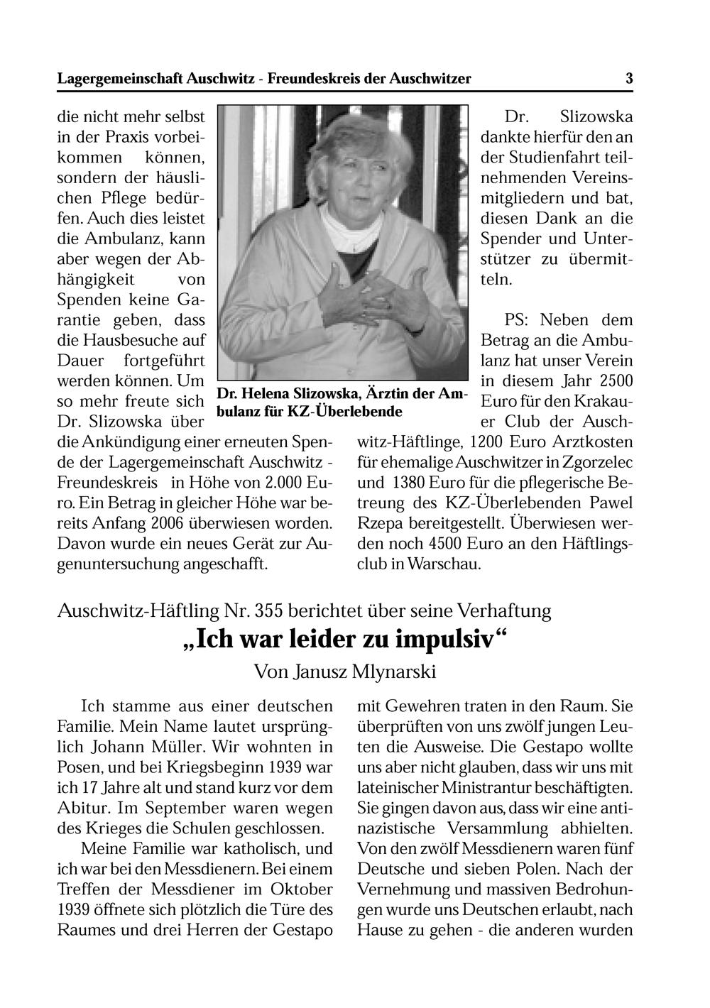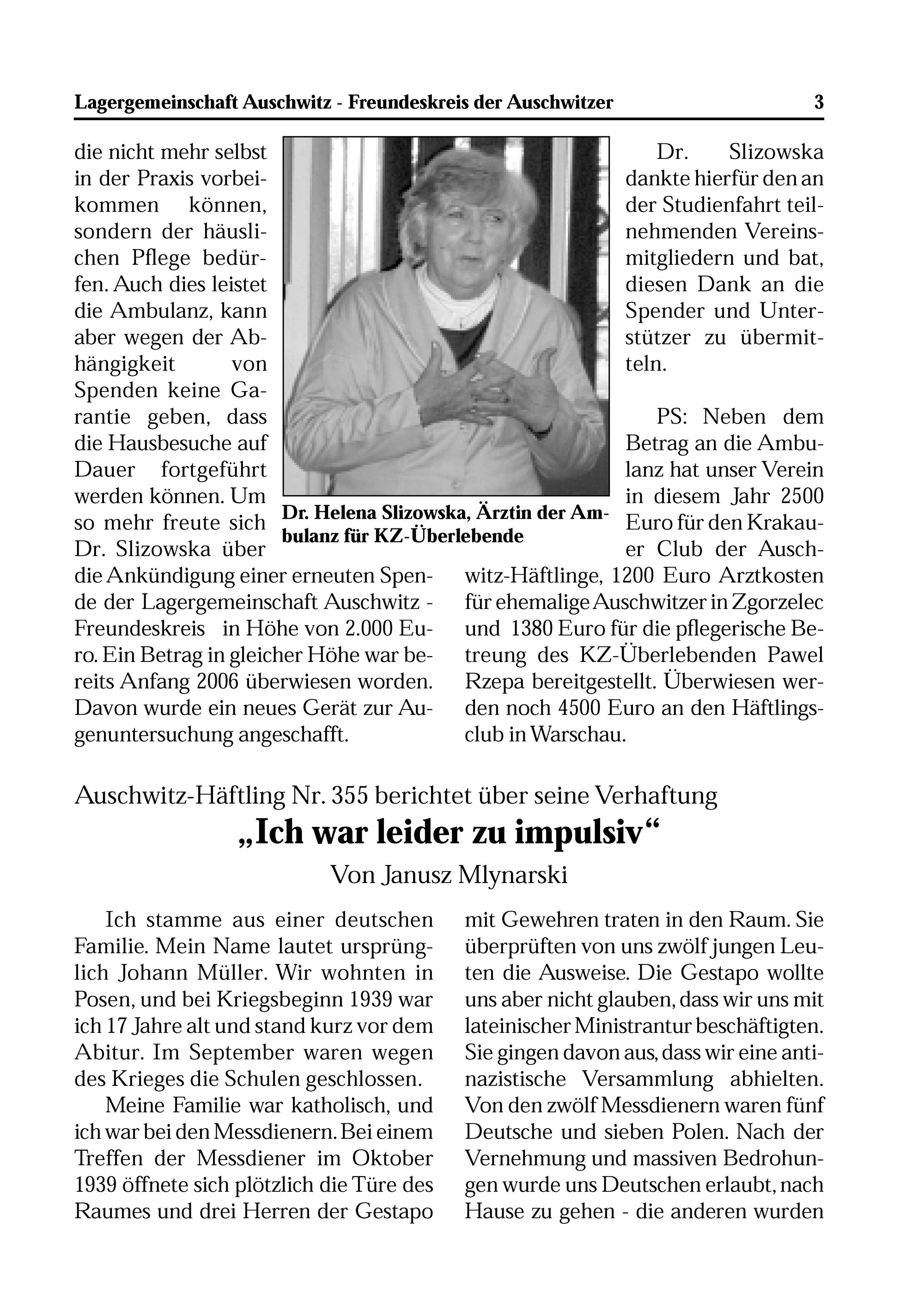 werden kõnnen. Um 8s0 mehr freute sich Dr. Slizowska über die Ankündigung einer erneuten Spen- de der Lagergemeinschaft Auschwit?- Freundeskreis in Höhe von 2.000 Eu- ro. Ein Betrag in gleicher Höhe war be- reits Anfang 2006 überwiesen worden. Davon wurde ein neues Gerät zur Au- genuntersuchung angeschafft.